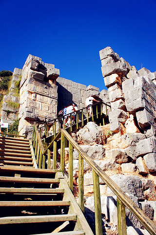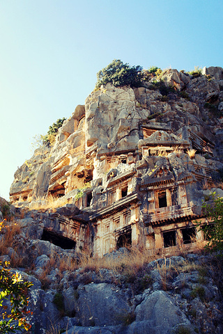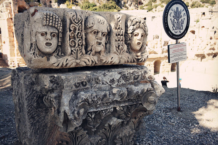 Myra是当年的lycia重镇,和Xanthos, Patara, Pinara, Tlos, Olympos一起,是当时lycia重要的几大城市。虽然当时在一起只算得上是平分秋色,不过今天的myra以其保存完好的历史遗迹获得了更多游客的青睐。Myra得名于一种采自木本植物的香料,还有一个很美丽的传说关于这个被变成香木的漂亮女孩。 Myra的古城遗迹很紧凑,环形剧院和岩体棺木的总面积并不大,但是却非常独特。 环形剧院的脸谱雕塑和其他罗马古城精致细腻的舞台神像雕塑不一样,充满了神秘而又沧桑的气质,那空空的大眼睛似乎又充满了一切神情的凝视着上千年历史的更迭变迁,也似乎要吸引了关注者的魂魄和精神一般。
