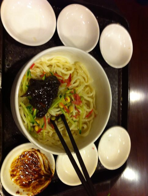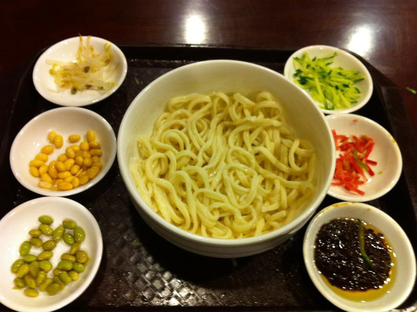 北京炸酱面一直都大名鼎鼎,但在南京我还从来没有吃过,这次来北京,看到老北京炸酱面就一头扎进去了。别的没点,就单点了炸酱面,看着周围的人也都是奔着这个来的。一碗面,5碟菜码,一叠炸酱。如果没有炸酱,就更像南京经常吃到的凉面了。菜码都是普通的小菜,黄豆,毛豆,豆芽,黄瓜丝,腌萝卜丝,感觉吃着也不怎么顶饱哈。就这么全部往碗里一到,再搅拌一下就行了。因为炸酱里面本来就有油,所以碗里的面就比较干,这次一中和就正好了。我感觉炸酱有点偏咸了,而且油汪汪的,没有我想象中的好吃。后来说给北京的朋友听,他们都说炸酱面就这么味儿,我彻底郁闷了。这么一份也要36块钱,只能说尝试一下吧。这家店非常靠近前门,从天安门广场步行1公里就能到,如果是坐地铁从前门站下来步行500米就到了。