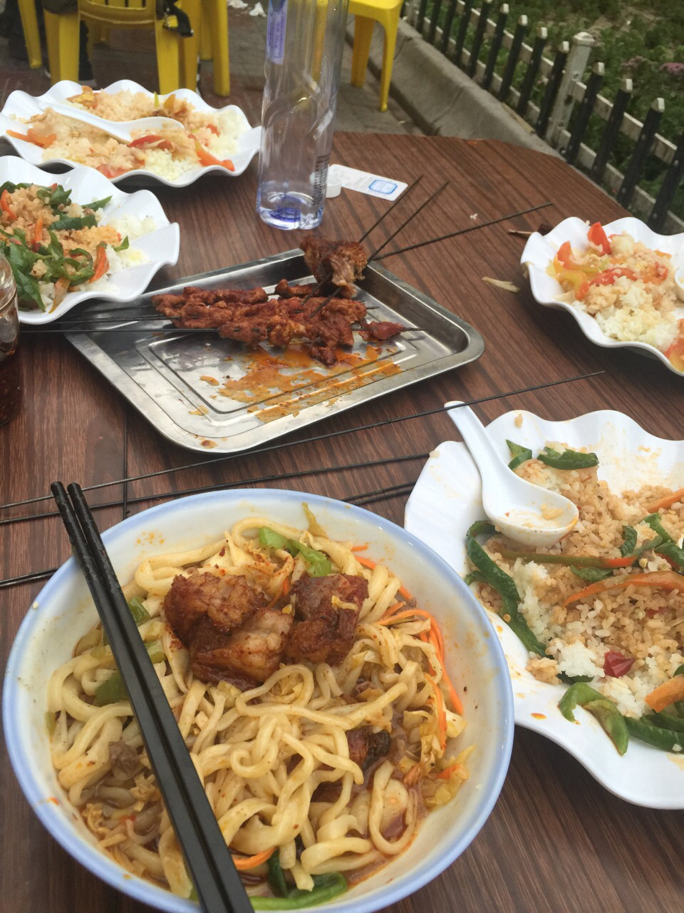 由于住的是回民区,也就只能入乡随俗了,当地很多烤羊馆,拉面馆,我们选择了一家,点了饭之后发现味道真的不咋地,烤羊肉串根本嚼不动,上来的拉面第一次竟然是很宽的那种,跟烩面差不多,一搅竟然有只虫子,果断叫老板换一碗,味道实在不敢恭维Zzz…比在张掖吃的炒面片和牛肉面片差远了,吃得好生不愉快