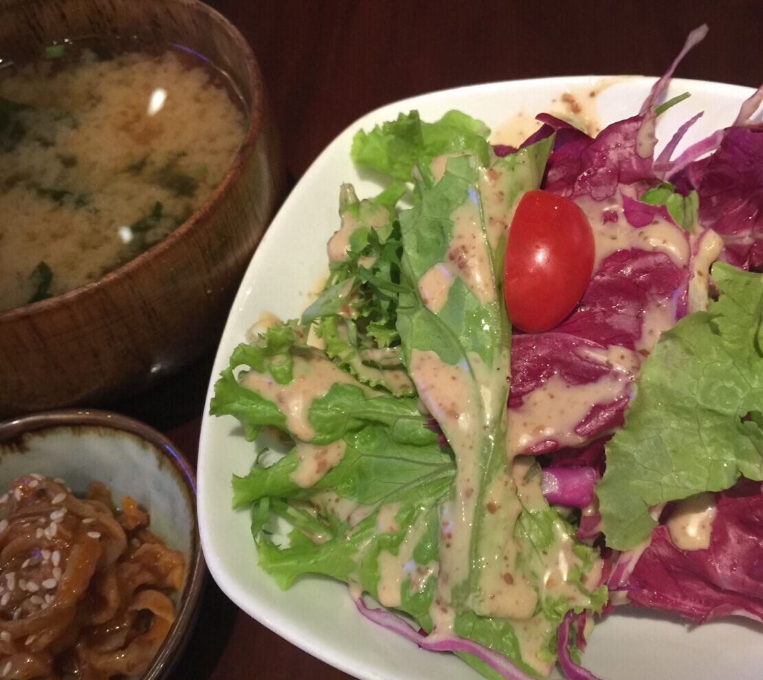 味噌汤和拌菜沙拉味道都很地道,凉菜有海藻、萝卜条以及海带等