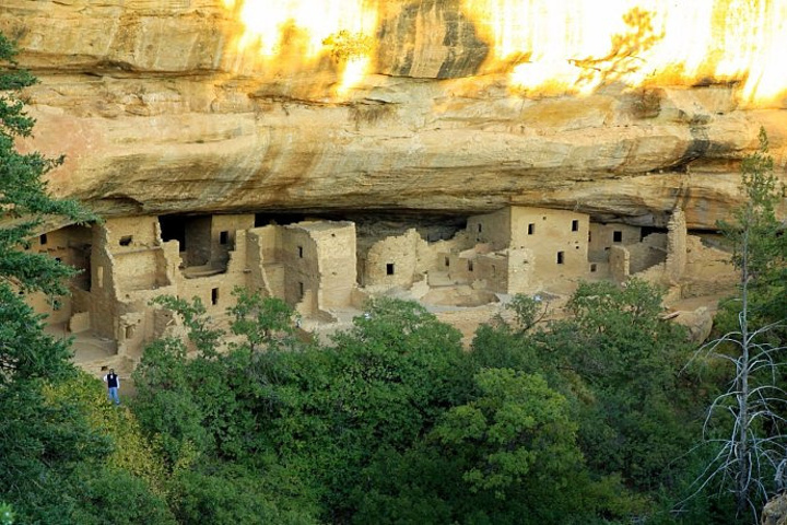 我们开车沿着160号公路东北方向进入了科罗拉多州。下午5点多钟我们来到了科罗拉多州西南部的Mesa Verde National Park 梅萨维德国家公园。 梅萨维德国家公园是北美洲印第安人文化遗迹保留地,坐落在美国科罗拉多州西南部蒙特苏马山谷和曼科斯山谷之间,占地 2.01 万公顷。这里有4000多处遗迹,主要景点包括绝壁宫殿、云杉树屋、悬崖宫殿等。梅萨维德,西班牙语意为绿色台地,为 18世纪西班牙探险家起的名字。约在2000年前,一个叫作阿纳萨扎伊的印第安部族在此建立了小王国。起初他们在地坑里盖造粗犷的房舍,成为这里最早的聚居和以务农为生的印第安人。后为了躲避其他部族的侵袭,开始迁移到峡谷两侧的悬崖峭壁间,开山凿石,垒砌墙壁,构置峭壁石室,在历史上称为峭壁居民。公园内遗存的印第安人建筑遗迹主要有两处最集中和最大:一处是峭壁王宫,一处是云杉之屋。 5点钟过后,公园工作人员下班,公园大门无人把守,我们开车长驱直入。公园范围很大,开车20分钟才到达景点峭壁王宫。这时夕阳西下, 在峭壁王宫上面的岩石上还留有落日余晖,我们抓紧这最后的好时光拍照。游园时间已过,我们不能再下去来到峭壁王宫跟前了,只能远远地观望,就这样我们已经很知足了,赶在关门前作最后的游客看一眼知名的景点。