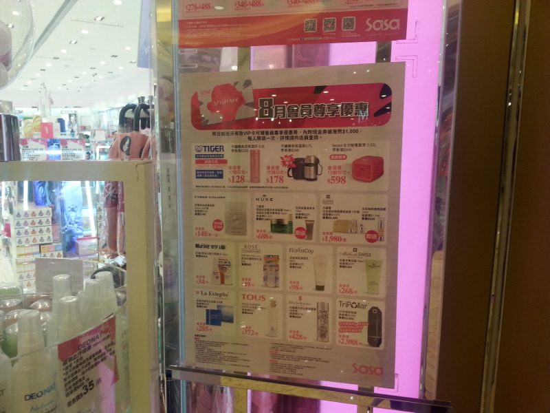 澳门有大约8家sasa的分店,其中一家就在金沙城中心的二楼购物大道里面。因为位于金沙城中心里面,所以交通非常便利,可以乘坐金沙城的免费穿梭巴士达到,也可以乘坐新濠天地和威尼斯人的穿梭巴士,然后走到金沙城中心那边。如果真的是没有穿梭巴士了,也可以乘坐15; 21A; 25; 26; 26A; N3到连贯公路/金沙城中心-公交车站下车,步行几分钟到达。这家sasa在澳门算是比较大的了,而且基本的品牌都相当齐全,其它sasa分店该有的,这里也有提供。这里出售各类香水、护肤品、化妆品、面膜、洗发水、沐浴露、身体乳、卫生巾、化妆棉等等的用品。由于这里的面积比较大,在店铺的最里面还有提供给客人休息,试用产品的桌子和椅子。这里的服务态度还是挺不错的,因为这里的客人不多,所以每次你进去的时候都会咨询你要些什么东西,不会像在新马路那边那些完全忽略你,或者没有空理你的。而且也因为这里的人比较少,所以无论你什么时候去购物,结账都是不需要排队的,我试过最多人的一次,也就是有两个人在前面,不像新马路那边的sasa,结账都要排队排个5-15分钟。所以如果不喜欢和别人挤的游客,可以选择在金沙城中心的sasa购物。和其它sasa一样,每个月都会有一些会员特价产品,每个有sasa会员卡的会员都能以超低的价格去购买指定的产品。而且除了每月的特价产品以外,这里还有每周特价产品,有兴趣可以多多留意,可以买到超低价格产品哦!