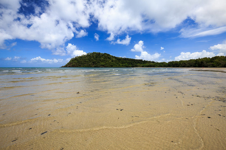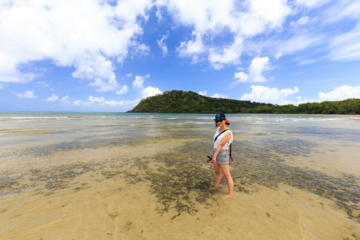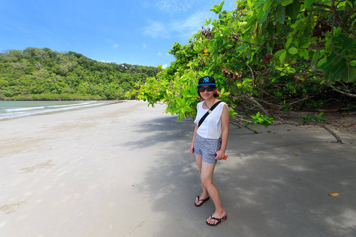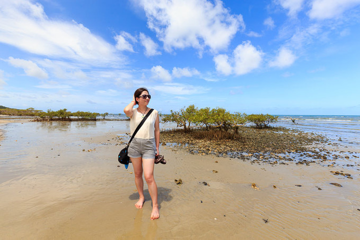 赤脚踩在热热的沙子里,沿着海岸线往前慢慢踱去,一边欣赏雨林的郁郁葱葱,一边瞭望大海的壮阔,走到海岸交错的尽头,还发现了一些水中的植物,远远看去有些后现代的感觉。这块区域也是礁石遍布,和刚才走过的软绵沙滩明显不同,不由感叹大自然的奇妙。又在这里各种摆拍,以至于回去后朋友都问,为什么你在澳洲的照片周围都没有人呢?因为这地方就是地广人稀啊,就是没有人任你一人撒欢啊,啊哈哈哈哈。