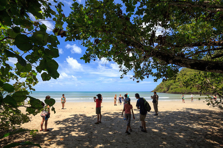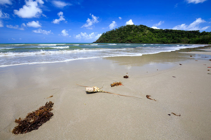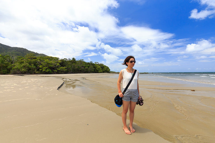 渐渐靠近目的地,两边开始出现了餐厅和公用厕所,老外在景区基础设施上真心做的不赖。下车休整,到游客中心取些资料,顺便把LG精心准备的食物(甚至还一人一个大鸡腿)两个人又大快朵颐的消灭,伸伸懒腰,完成最后一段路,到达了特里比来申角,又叫苦难角,也是伟大的库克船长在这里磨难最多的地方,差点就绕不过去了,呵呵。 下车后一脚踩到了沙滩,很奇特,周围还是茂密参天的雨林景,而脚底已经是绵绵的沙滩,沿着指示牌穿过一条雨林中的小道,大海在前方突然出现,那种视觉的落差非常美妙。一堆人围在出口处拍个不停,就是想留下这雨林与大海交错的时刻,我们自也不例外。拍完走到沙滩上,蜿蜒的海岸线上游人并不多。但也有几对老外已经躺下开晒,真是服了他们,是有多么热爱阳光啊。