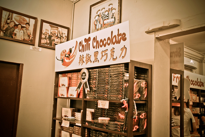 在商品区,这里可以试吃各种款式的巧克力,咖啡味的、榴莲味的、黑巧克力,最特别的要数这款辣椒巧克力。初入口是普通巧克力的味道,然而强烈的辣味立刻猛烈扑来,这么重口的巧克力真的有人爱吃吗?楼主对此深表怀疑啊。。。