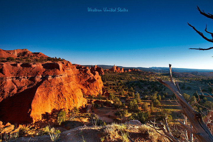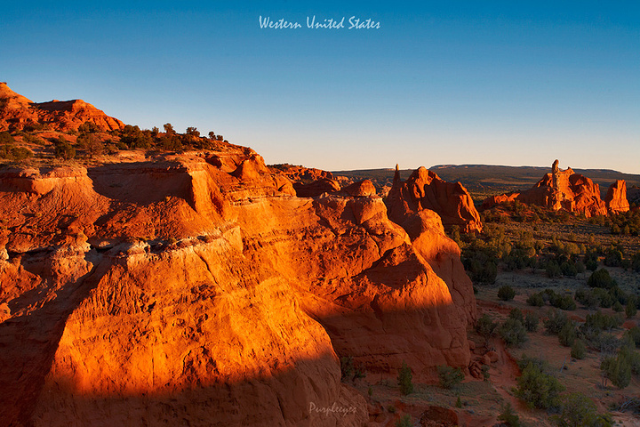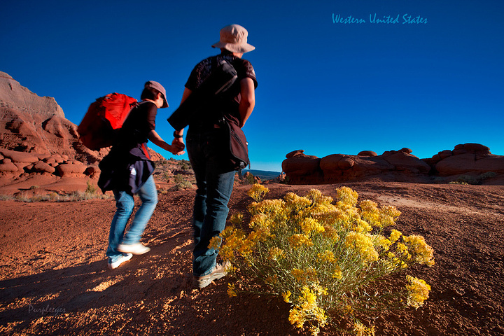 Kodachrome Basin State Park,这个地方要稍微的介绍一下,这个地方我们是在阿斌的游记上看到的,因为离布莱斯峡谷不远,而且比较生僻,所以我们打算去看看,拍拍日落神马的。这个地方也是以红色岩石出名的,但岩石的状态跟布莱斯峡谷的万剑穿心型是不一样的,它们基本都是圆的,最出名的是几个石柱子,它也是圆的,用某一对儿男女的意思来讲,就跟男性滴**是一个样子滴~,明白了吧? 这个地儿从潘圭奇走,大概要开车一小时二十分钟,过了布莱斯峡谷之后再往前开就是小路了,路上半天都没有一辆车,也会时不时翻过一个小山坡,配上迷鹿同学走之前下载的乡村音乐,特别有那种美国公路片的感觉,而路边大丛大丛盛开的黄色野花更是为整个路的风景增添了一道亮丽的色彩! 在不到五点的时候,我们到达了这个公园,进门的时候并没有看见啥特殊的景象,在付了6美元为我们的车买了门票之后,我们就得到了一张地图,经过跟门口的工作人员攀谈,我们决定去到公园的最里面的一条拍日落比较好的徒步路线:angles palace,徒步4公里,轻度。通过参观这几个公园,我们是总结出来了,在这儿的取名规律和国内的某些起名儿规律是一样的,国内一般都叫神马“仙人指路”、“仙女峰”、“仙人洞”的,而这里就叫“angel***”,这都一个意思么!