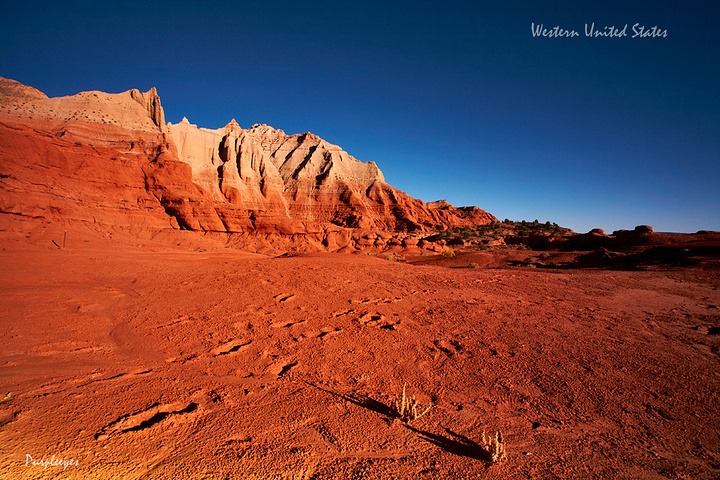 明月童鞋这次拒绝跟我们一起去徒步,号称太困了,我们就只好把她留在车里睡觉,三个人出发去也。在穿过一个谷底、再爬了一个小坡之后,我们就来到了一个高地,这里的石头就已经很红了,植被非常稀少。