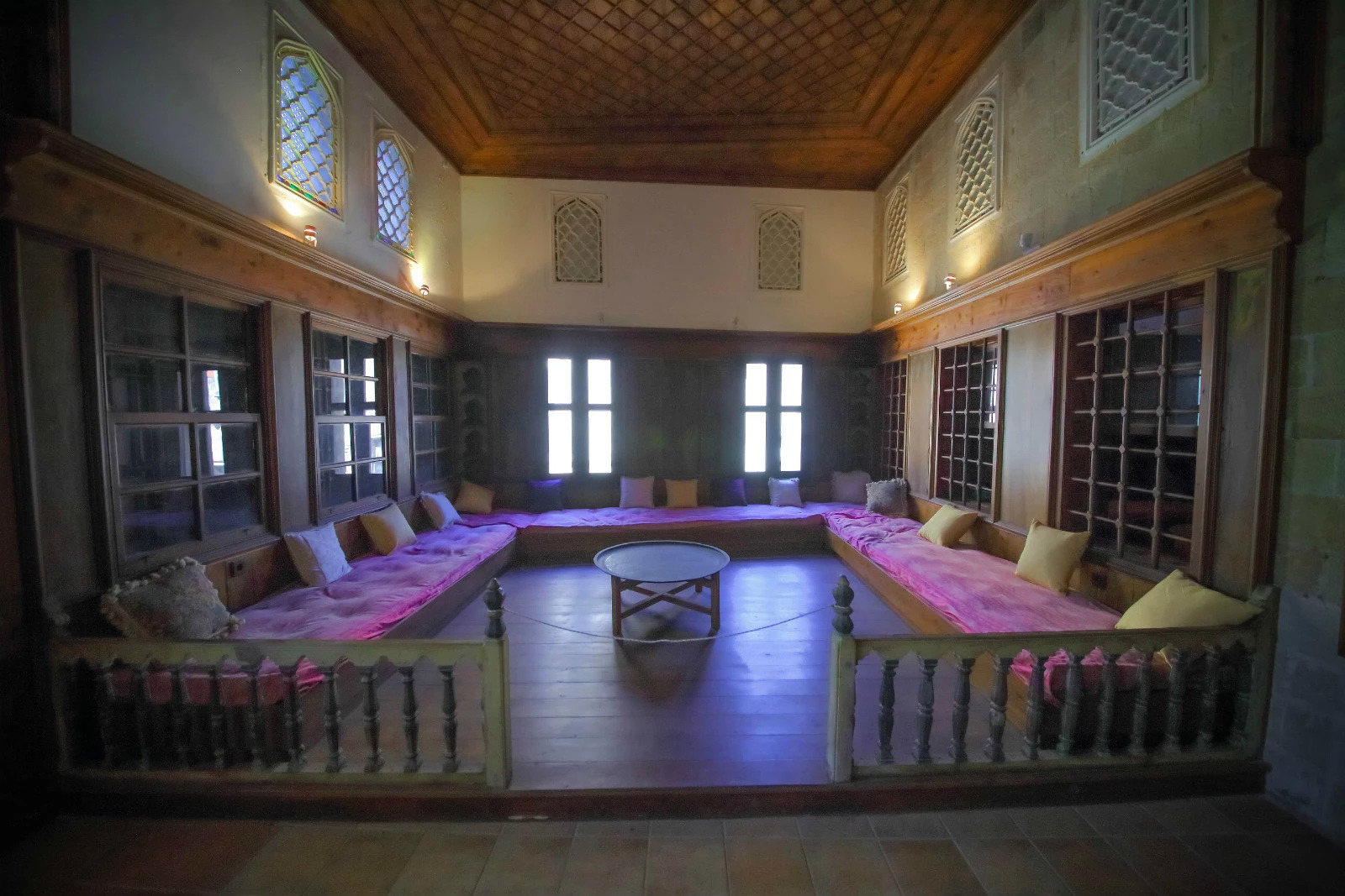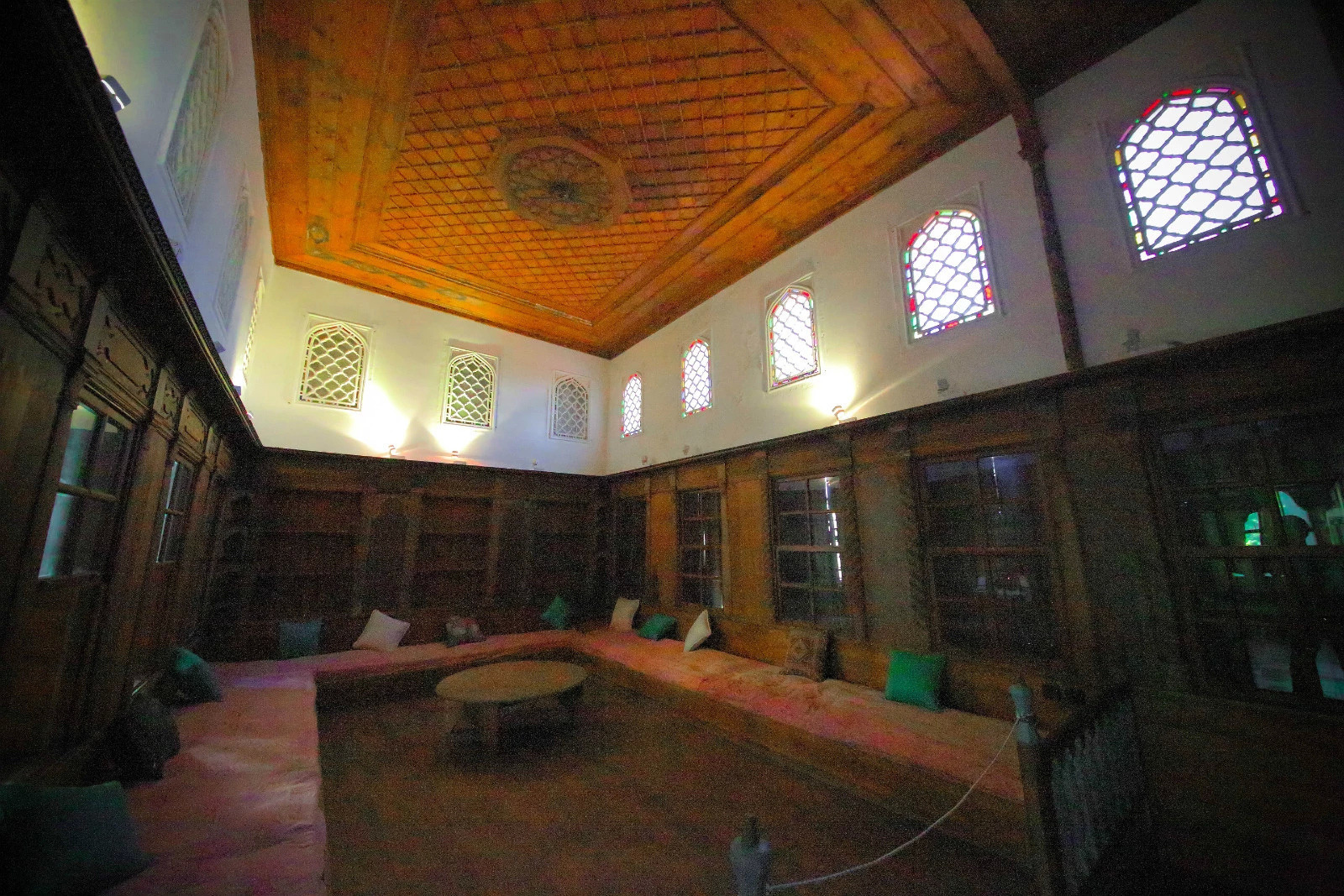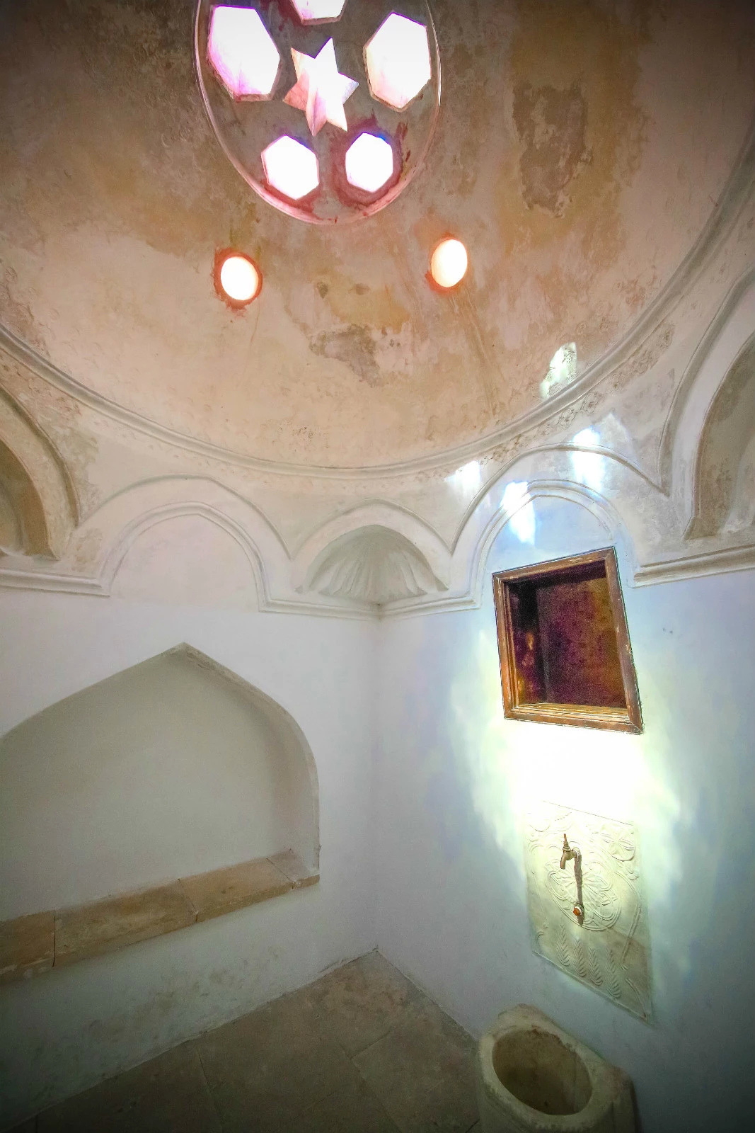 进入房屋更里面,来到浴室,这个房间屋顶的窗户很漂亮,有星星造型的透气孔。可能因为罗德岛临近土耳其,很多建筑风格和土耳其相似。这个浴室,很接近清真的装修风格,很有土耳其维其浴浴室的特色。
