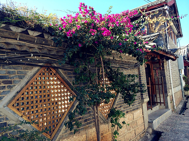 到达丽江是下午一点左右。出了机场就被一个当地大妈拦住让我们上他们的车(就是传说中的黑车),到古城70,说是比打车便宜多了。没有什么国内经验的我们也就毫不考虑地坐了。开车的是大妈的老公,听这对夫妻说他们只是想出来多挣点钱给女儿赚学费,要是有生意尽量介绍给他们。(后来听说有人做黑车被开到很偏的地方载了几千的,想想才后怕,看样子我们的运气还不错。还是建议大家不要找黑车了。) 老夫妻把我们放在了古城门口,等着老板来接我们去客栈。丽江的客栈很多都很隐蔽,自己拖着行李箱很难找到。这是我们住下的芝麻开花客栈,在比较安静的古城深处。客栈虽小,但是装饰得很有情趣,是我喜欢的调调。