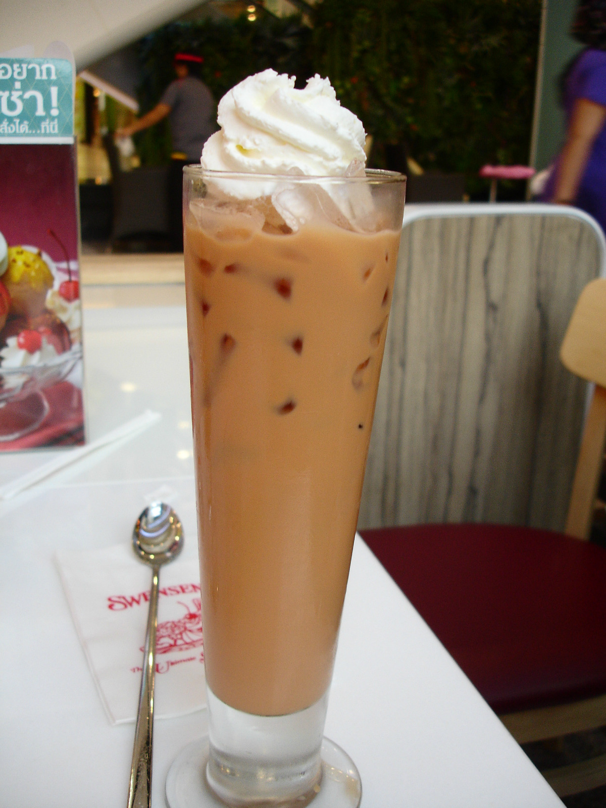 这个是泰国很普遍的冰淇淋品牌,在曼谷的platinum shoppingmall内一楼,在曼谷市中心水上市场对面,进门左手边,还是比较醒目的,门店不大,店内大约有4-5张桌子,店外也有几张,供应饮料、冰淇淋。服务还不错,上来每人送一杯冰水,炎炎夏日真是好赞啊。有各种冰沙,芒果冰沙很赞,我点了一份芒果冰淇淋和冰咖啡,味道不错。店内装潢也是走热带风格,很丰富的色彩。这家冰淇淋主要是水果很赞,也许是因为泰国当地水果好吧,芒果菠萝不会像国内的一些冰店酸的不行,很甜。价格也还可以,冰咖啡折合人民币16,冰淇淋折合人民币20。冰淇淋外面的鸡蛋饼很好吃。这家分量还是很足的,这样两份其实3-4个人吃是够的。