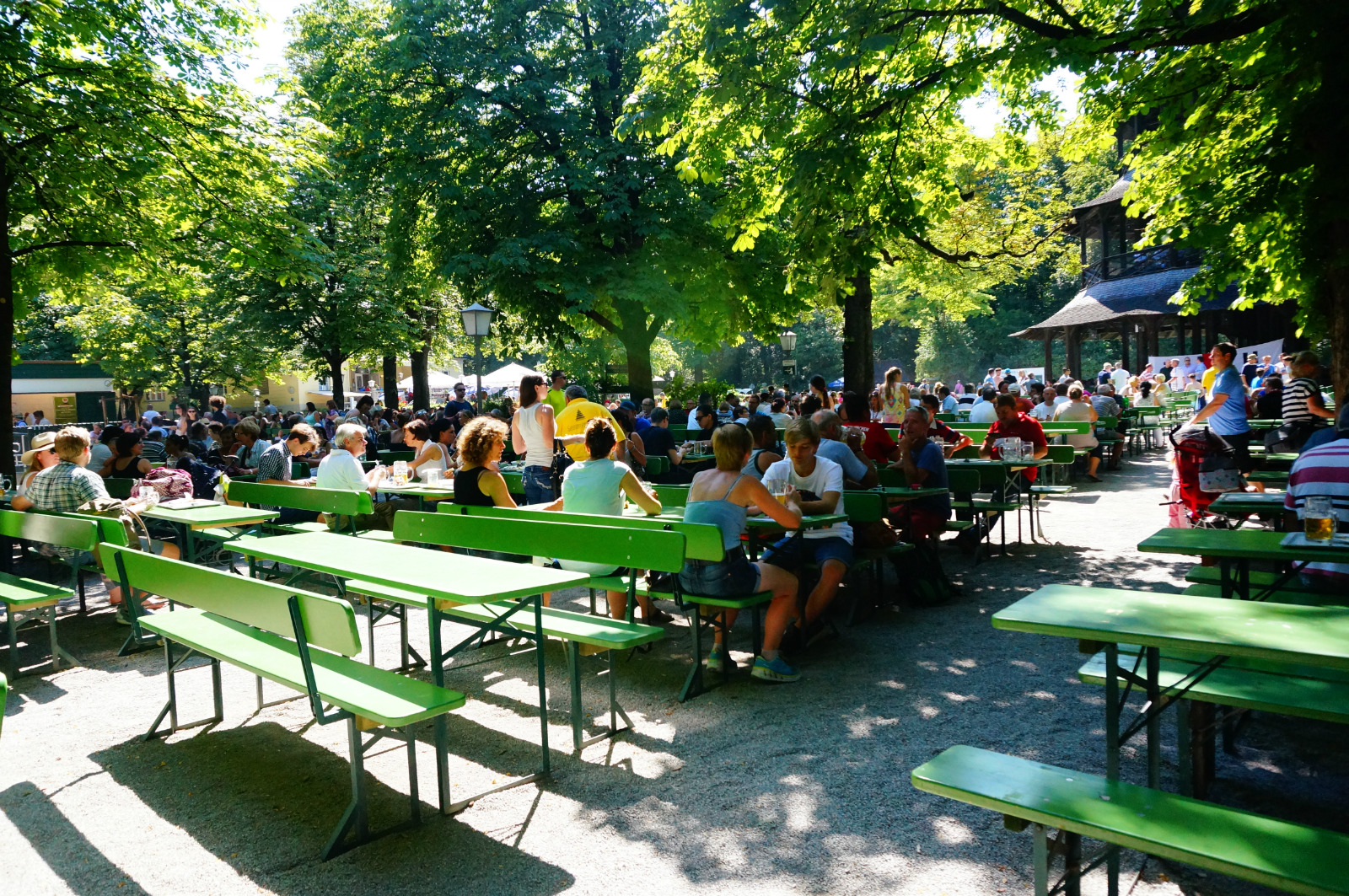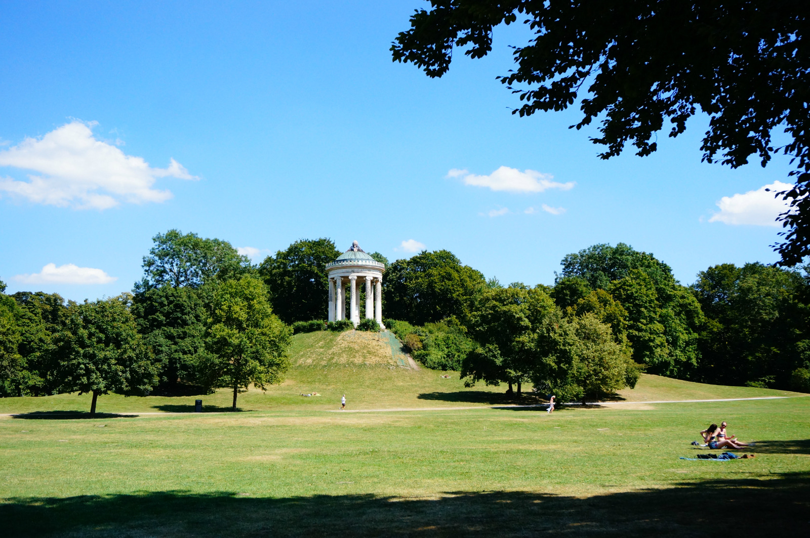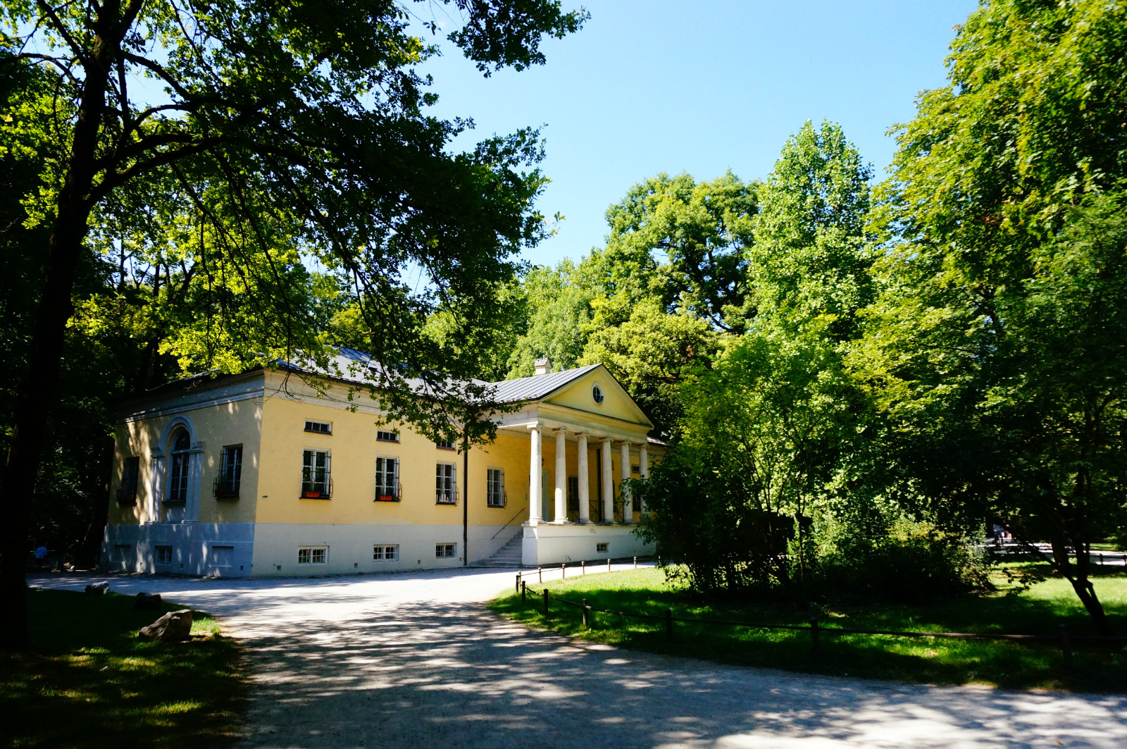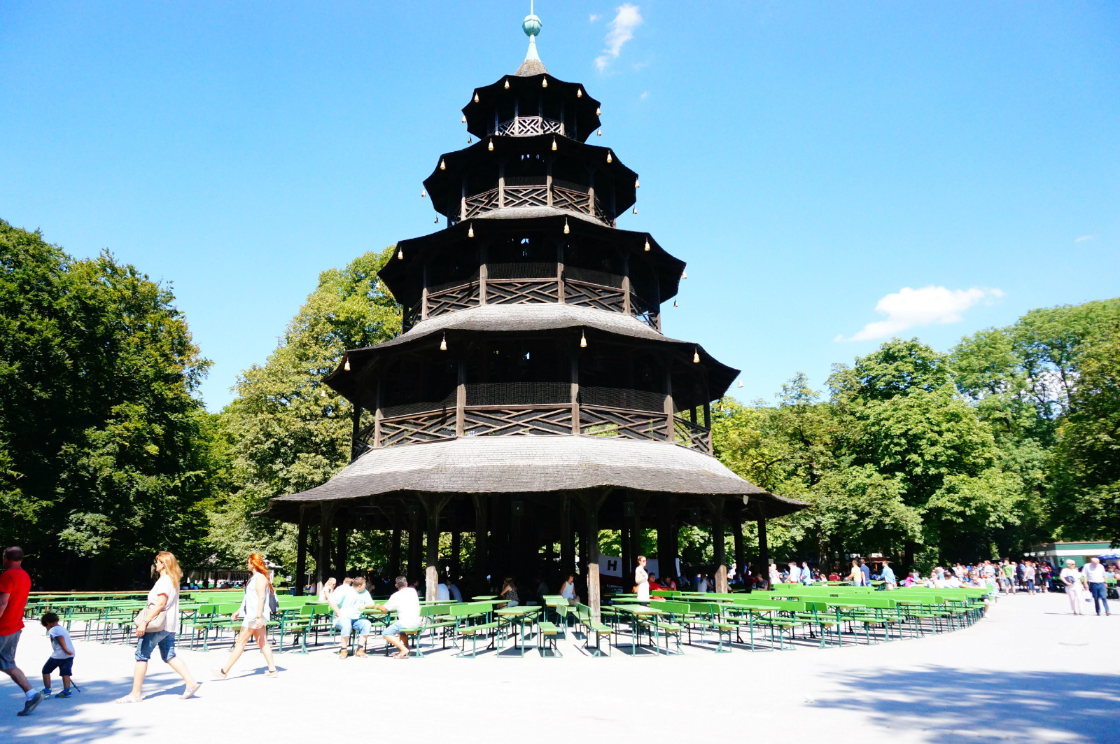 中国塔其实不能是说个独立的景点,与其说景点不如说是个食肆,因为它位于英国花园中央,周围大片草地地,很多学生坐在草地是读书上,聊天,中国塔其实算是个餐厅,周围放置着一排排绿色的长椅,去的那天刚好是举行什么盛大庆典活动或什么节日似的,不仅长椅上坐满了客人,周围还设置了很多小食摊档,除了没有素食外,德国传统美食几乎都有,完完全全一条食街模样,还在外面拉开国旗,有乐队在演奏,用餐的客人还出去和乐队一起呐喊,好不热闹,转了好几个角度就拍到一张没那么多人的照片,怎么到达,坐地铁U3,或U6 在Odeonsplatz站又或Universität站也可以在Giselastraße站下,我是从Universität站下的,走出地铁口,越过几个树林,穿过几片草地,一直开着谷歌地图,走了将近两公里才找到英国花园,但离开时是从Giselastraße站离开,所以还是建议坐到Giselastraße站,出站后前行100米右转,再一直走800米左右便到达英国公园,然后沿着右边的小路再一直走,直到看到中国塔。其实这里最好的玩法是骑自行车,中国塔前面有指示牌标着整个公园骑车的不同路线,按着这些路线骑完后,最后回到中国塔用餐,坐在草地上晒太阳,多惬意!