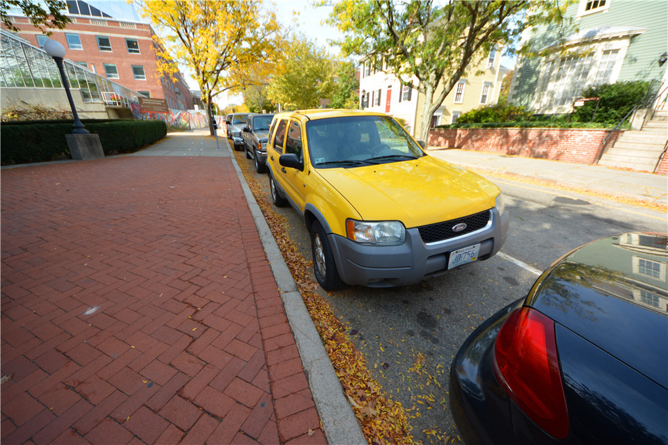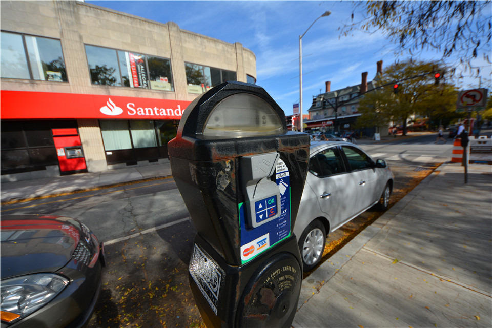 布朗大学的停车很成问题,路边你找不到停车场,街趴也很容易搞错,好多地方都是限时一个小时的,好多地方要交钱,乱七八糟的,一定要看清楚, 否则就吃ticket,我们就吃了一张。要钱的街趴是一元钱四个硬币管一个小时。
