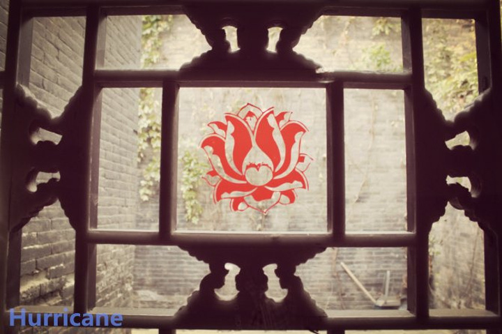 客房门的玻璃上贴着传统的红色窗花,很有地方特色。
