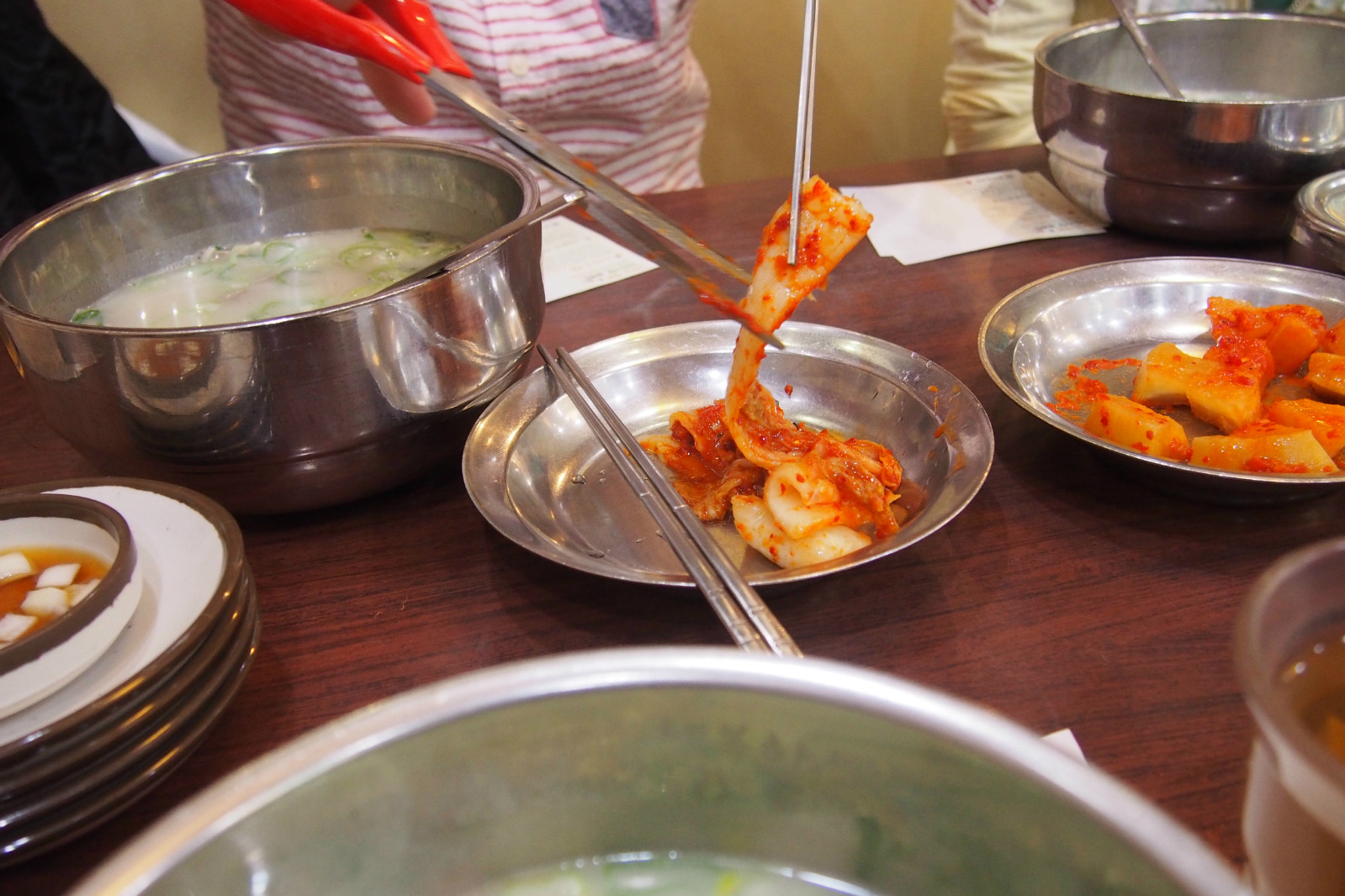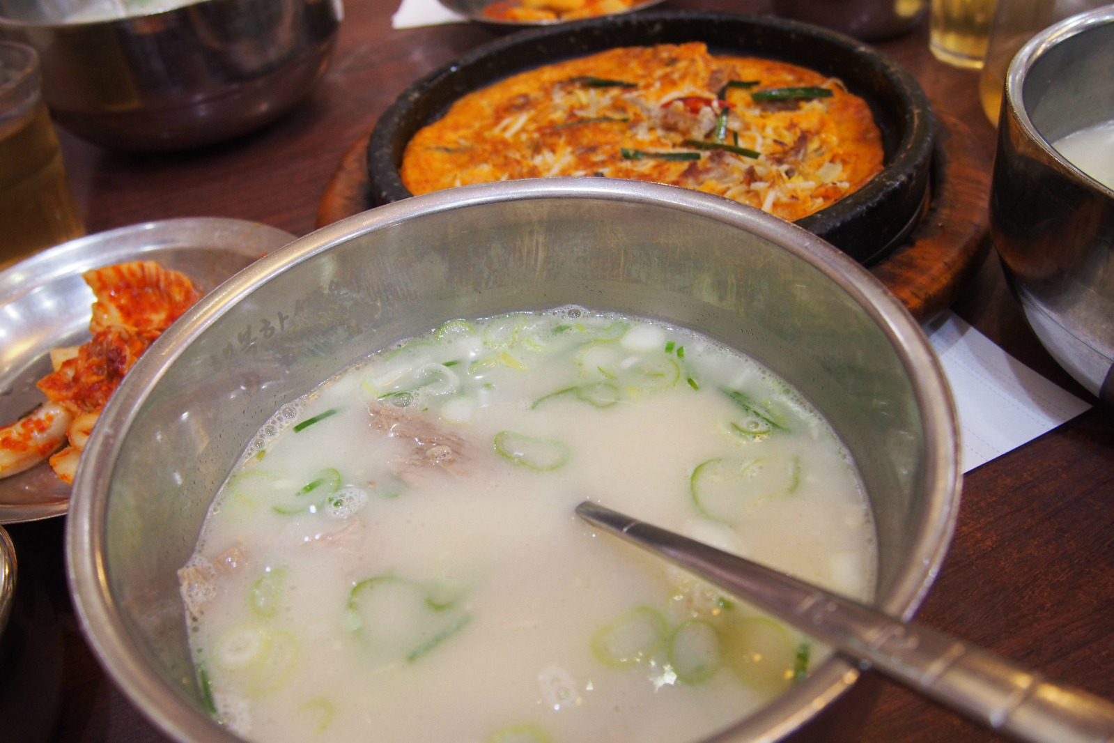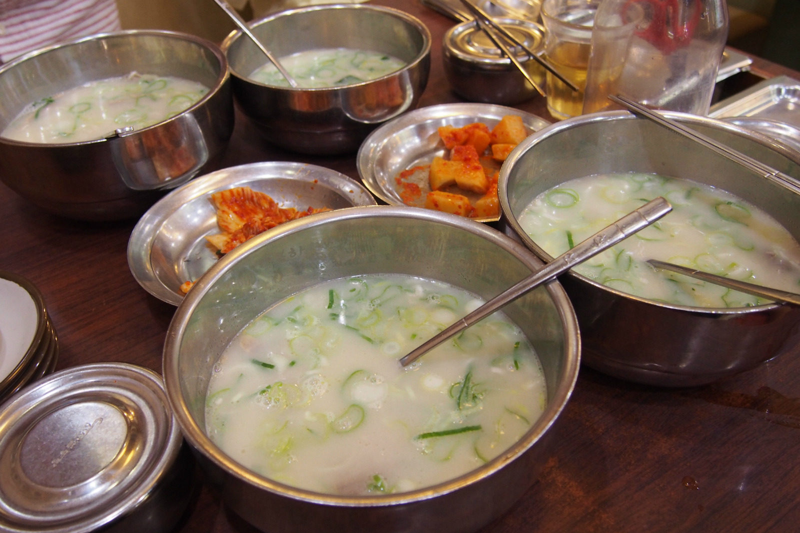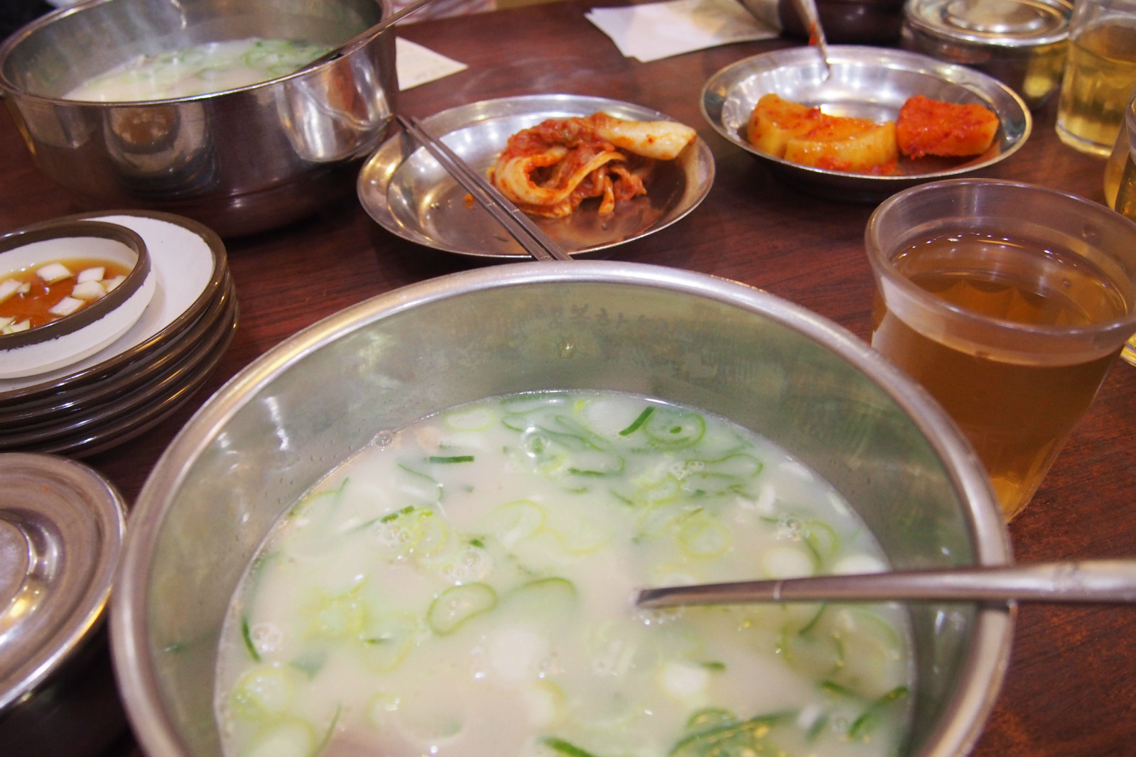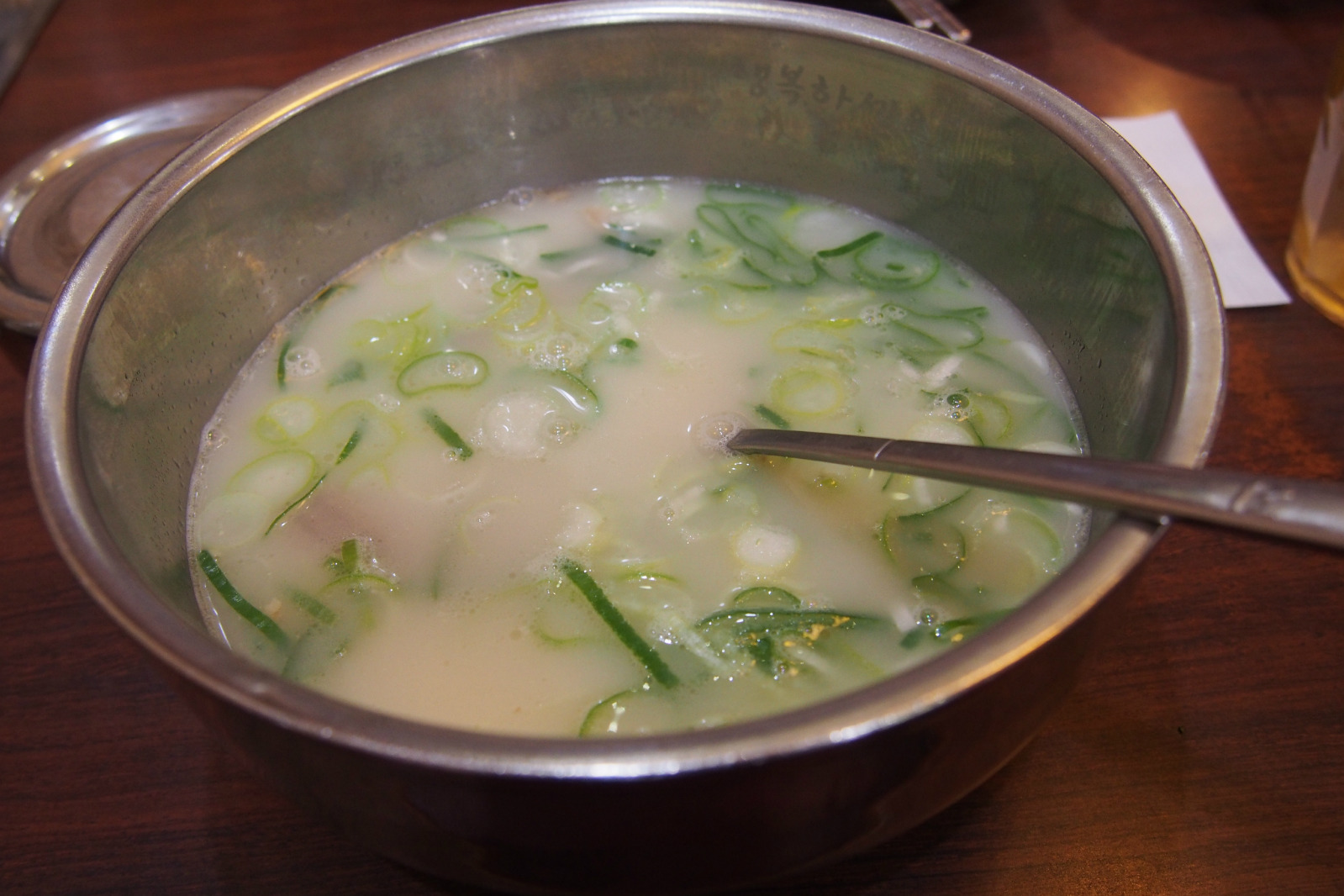 韩国招牌的美食,但个人味道一般般,实在太淡,我不是很推荐。两家连锁店明洞和弘大,去哪个随意啦!两家店水平相当。弘大店可以乘坐地铁到弘大地铁站就好,出来100多米就能看到了,听说是家族企业哦。店面不大,座位显得比较紧密,有点拥挤,胖人可能觉得不舒服,当天是早一点到的但是人也很多哦,人多时候感觉人挨人的,所以不是很舒服啦,好在只是喝个汤也耽误不了多久忍耐喽。店名很有趣叫神仙雪浓汤,可能是一种让人觉得汤很美味,喝了好似神仙的感觉?不管怎样,雪浓汤是他们家的招牌加主打,7000起,大份的10000,根据牛的部位不同有所区别。此外,他们家的饺子和煎豆腐、泡菜饼也都不错。不过主打菜雪浓汤实在太淡了,淡到我感觉再喝白水,虽然汤底很新鲜,肉味也够,但是总觉得淡淡的,牛肉也没味,肉给的也不多,总体就是再喝汤。好在韩国的餐厅都免费提供泡菜和辣萝卜,我们才把汤喝完……碗很大,汤很多,但是真的不够味,也就尝尝,下次不会再去了。服务什么的都不错,他们都会中文还有中文菜单,点菜不是很费劲,不过菜品选择不多,基本就是我上面说的那几样,建议当早餐喝的暖暖的,午饭晚饭感觉吃不饱哦!这家店似乎是24小时,不过需要您在考证啦!