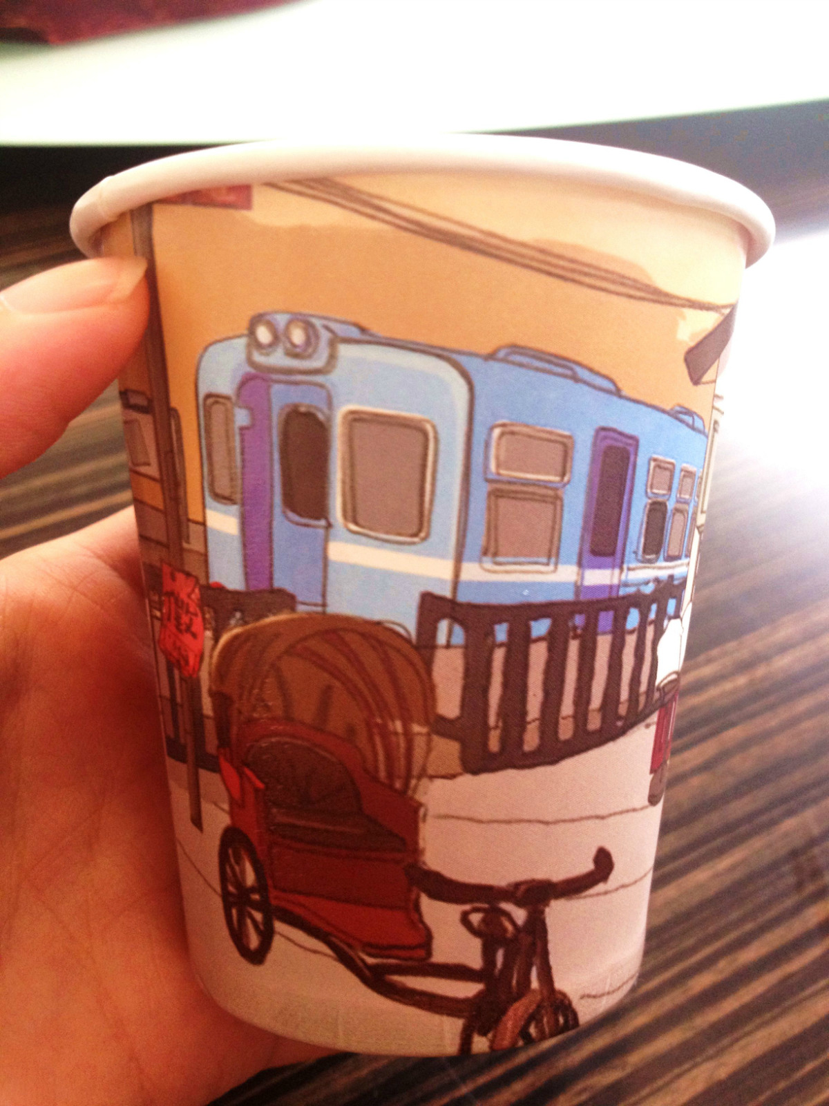 人文怀旧高雄馆是一家怀旧主题餐厅,非常有特色,在门口乍一看还以为是电影的拍摄基地呢。小火车、复古的店铺招牌、大黑胶盘、木椅布帘还有二三十年代的音乐都能看出老板费了一定的心思,就连喝水用的一次性水杯都是定制的,上面绘有小火车和人力黄包车的图案,萌萌哒的,很可爱。