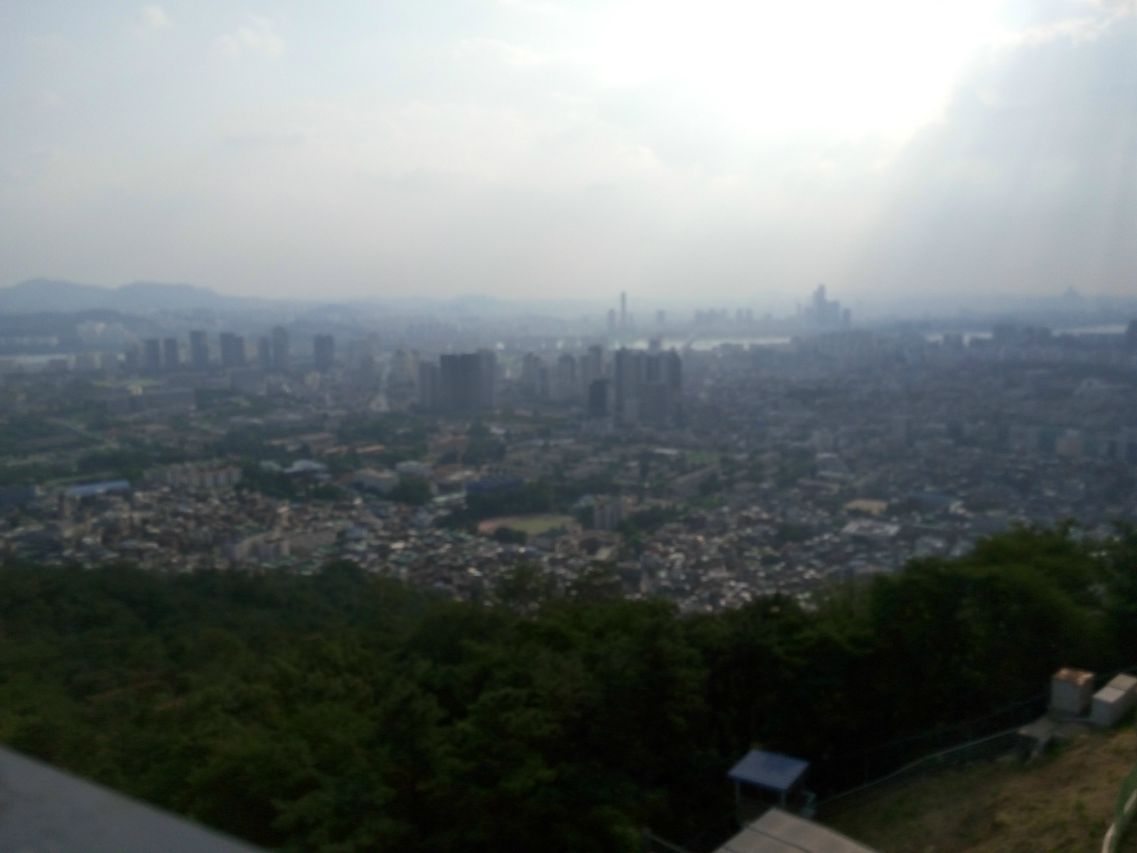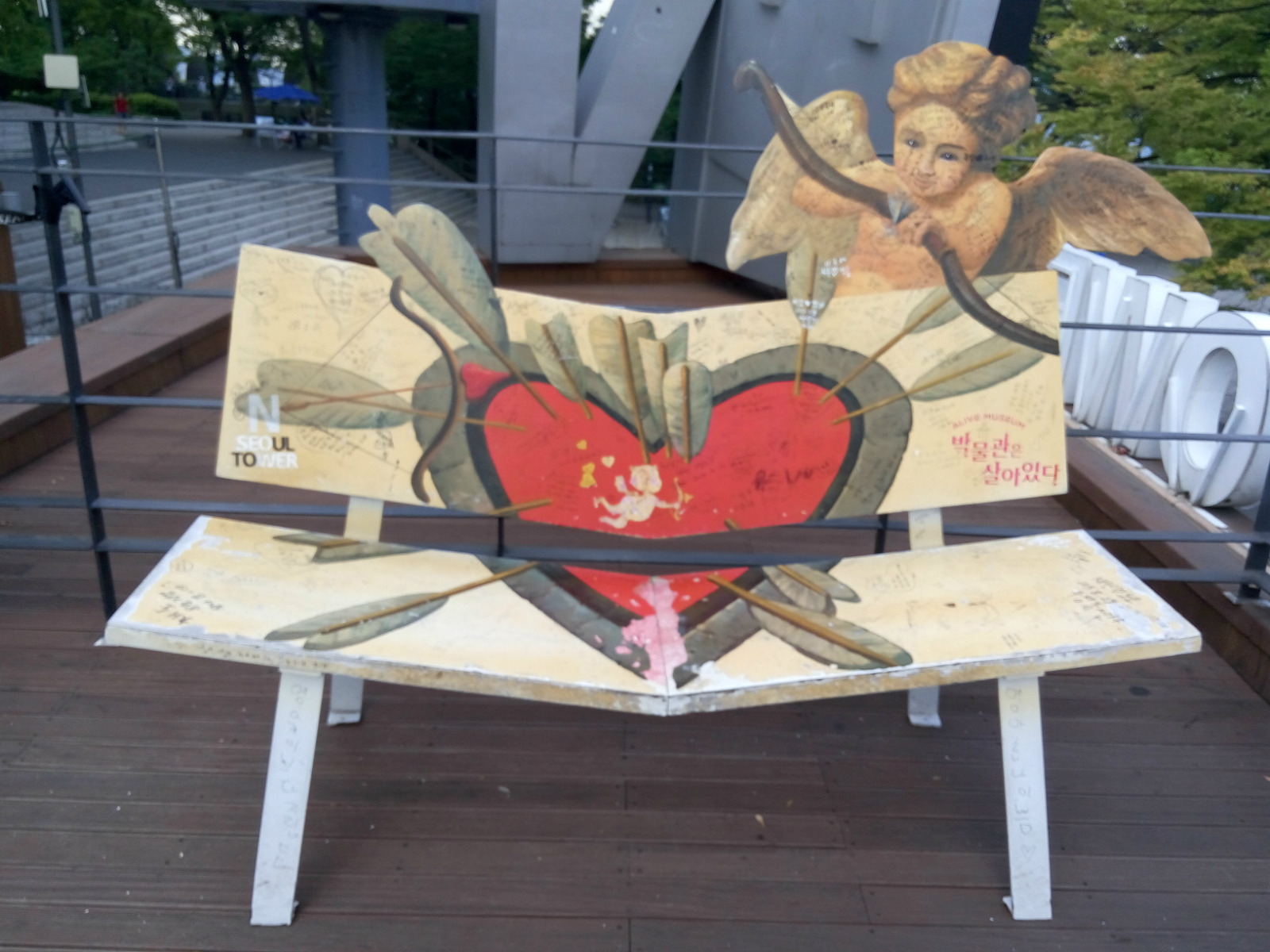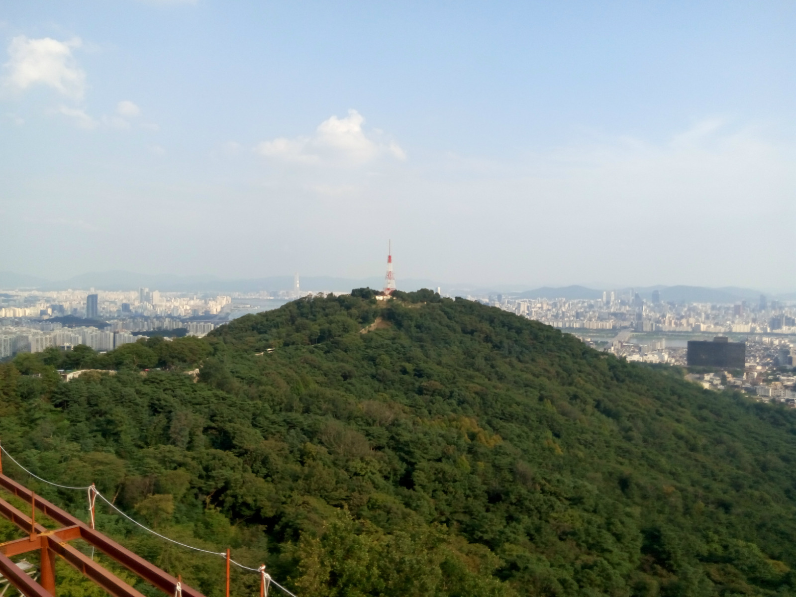 登南山公园是不收费的,上到塔上面才收费。还有图片中有很多锁的地方也是不收费的当时是做大巴车直接开到南山公园上,免了走路的时间,车开上去后有一块平地,步行上一个月45度的坡道,坡道不是很长。上去后依然是类似于小广场的地方,左手边就是N首尔塔,右手方向的位置可以看到明洞、景福宫等区域(只是看到首尔的景色,具体景点我也没有找到)