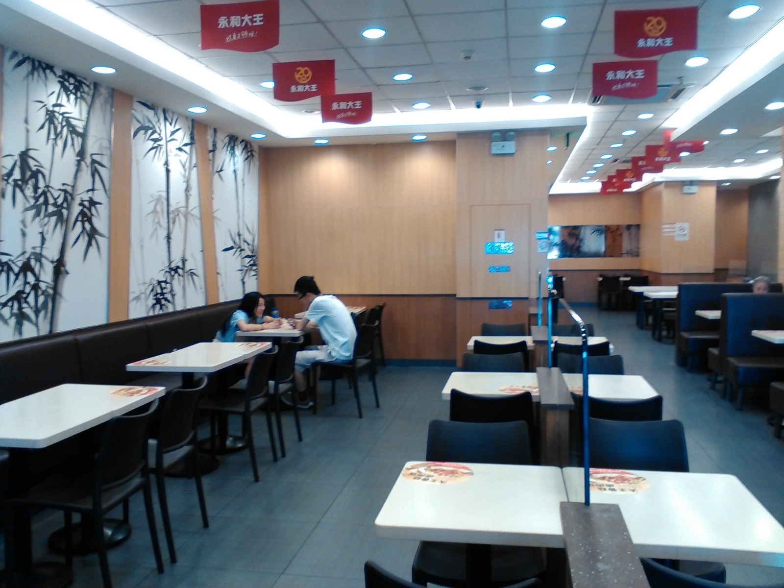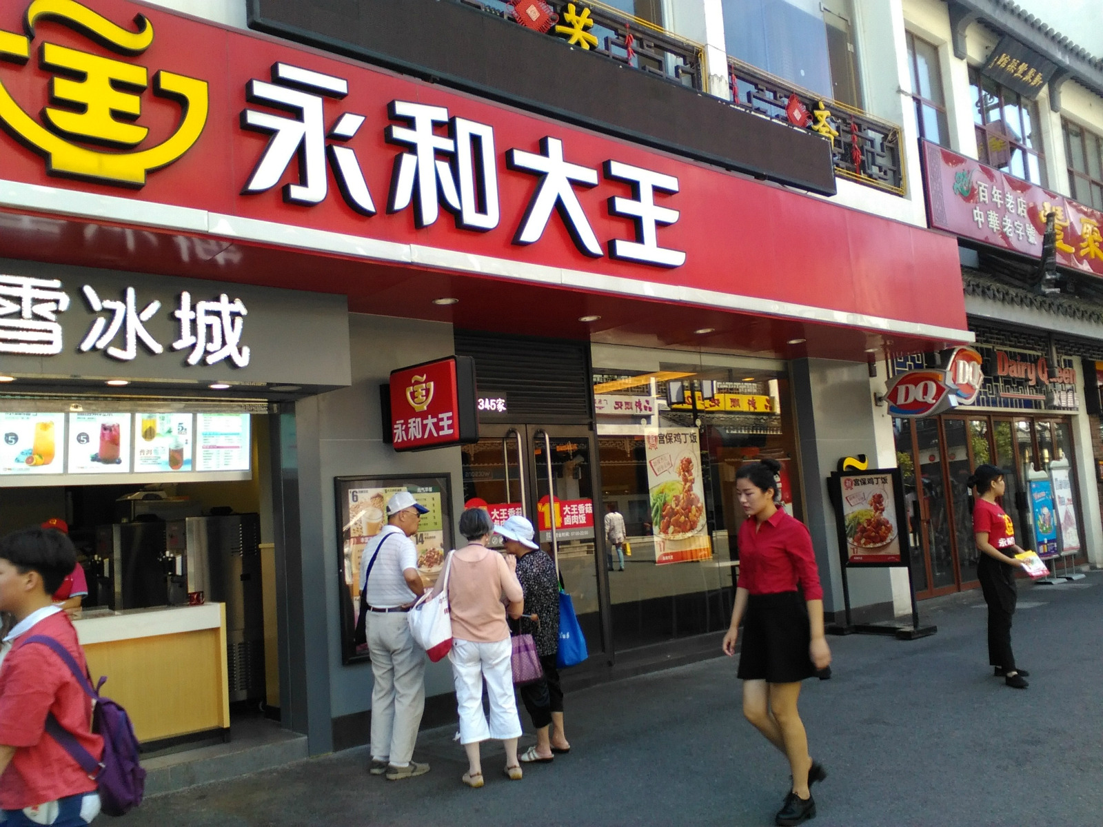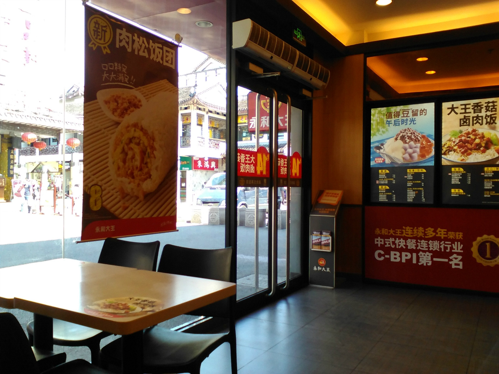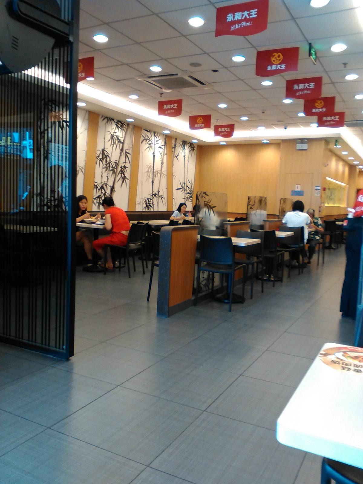 永和大王(观前街店)位于苏州市姑苏区太监弄1-5号,营业时间24小时,乘坐公交乘坐公交112路、 146路 、204路、 2路 、307路 、32路、 60路北环线60路南环线、800路、8路 900路、900路、923路、9路到乐桥下,步行几分钟就到太监弄了。永和大王的店门牌很显眼,红色底子白色大字,店堂内环境卫生看上去很干净,墙壁上有竹子的水墨画,诗情画意的柑橘,先在服务台点餐付钱,然后等服务员送餐上桌,推荐特色:永和豆浆、台湾大王香菇卤肉饭套餐、宫保鸡丁饭、梅干菜扣肉饭,套餐在24—30元之间一份,单点比较便宜,在14到20之间一份,单点的也配上一份蔬菜,一份套餐可以吃的很饱,一定要尝尝这里的大王香菇卤肉饭,肥瘦适宜,味道不错,这里的甜点豆花芋圆刨冰也很好吃,永和大王的早餐和别有一番风味,有油条、豆浆、小馄饨,尤其是肉松饭团,8元一个,滋味不错,只有早上才有哦,永和大王地处热闹的观前街,左右都是美食铺子,有苏邦口味的五芳斋,有老字号松鹤楼、王四酒家等,旁边是一家奶茶铺,可以说,美食琳琅满目,应有尽有,吃完了可以逛一下观前街,参观一下玄妙观,在茶馆听一曲评弹,或在三万昌喝上一杯苏州特产的碧螺春,这里离拙政园、狮子林、怡园、山塘街、平江路不远,有直达公交车可以到达。