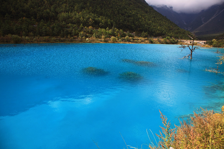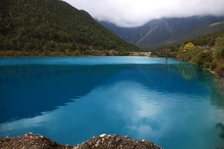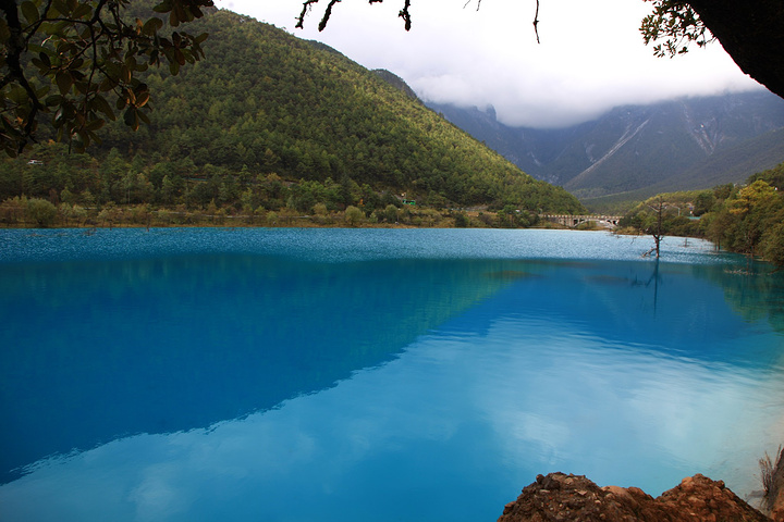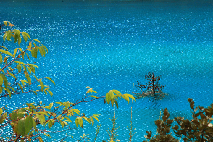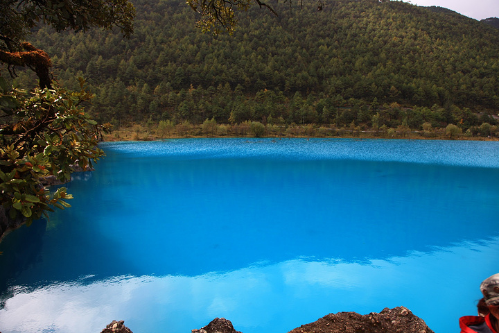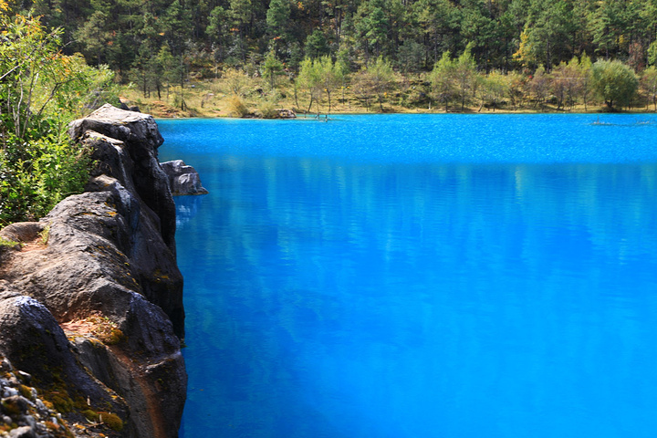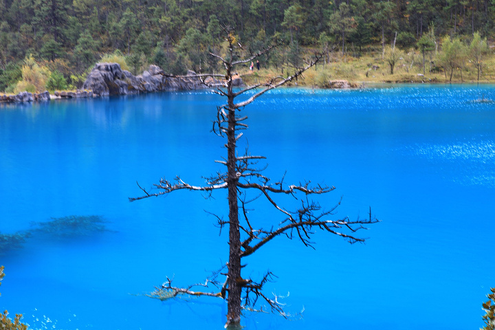 玉液湖在几个湖中的颜色是最深的,其他几个蓝月湖的颜色就要浅的多。导游介绍说,湖水中含有大量的铜离子,沉积下来后就形成了现在这个模样。