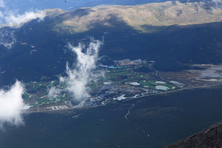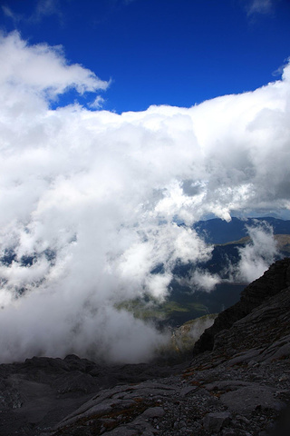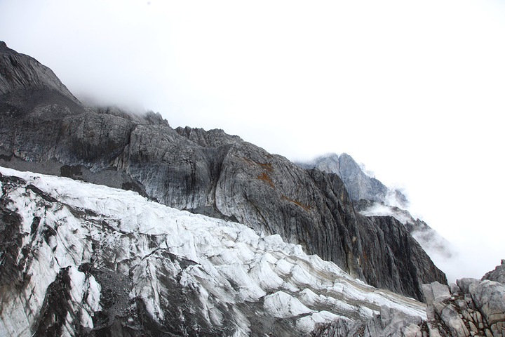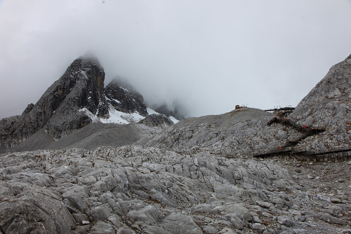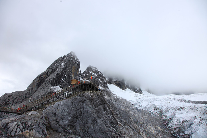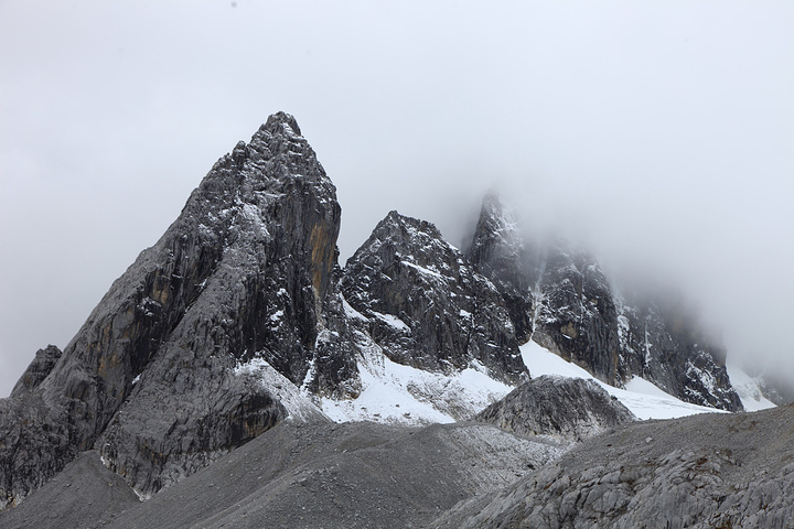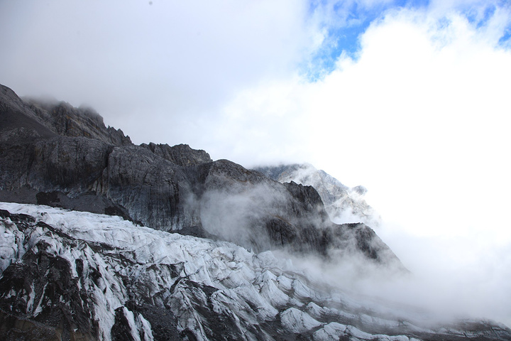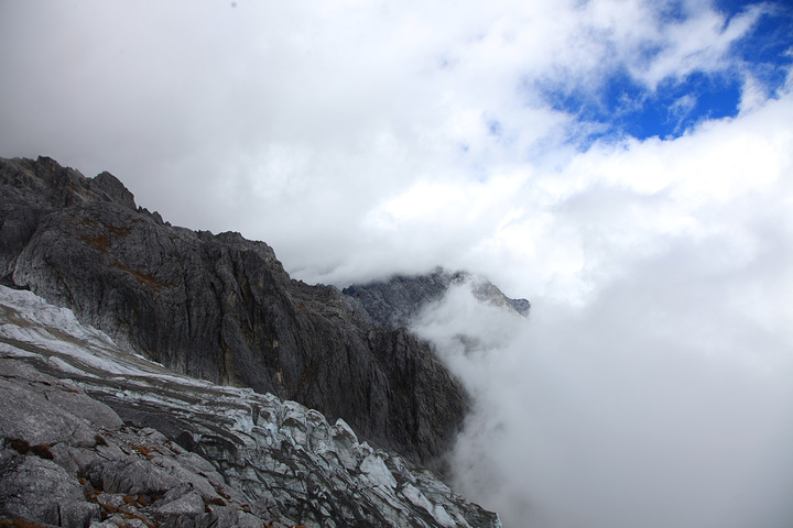 山上的积雪,我们去的时候天气不是很好,阴云密布,偶尔风吹过的时候才可以看到蓝天。 山峰在云雾里若隐若现。