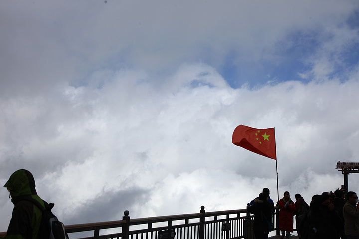 海拔高处飘扬的五星红旗。 在整个爬山过程中体消耗是比较大的,而且由于海拔高,温度有点低,我们十月中旬去的时候大概在5度左右,因此,羽绒服是必不可少的。而且气压较低,空气中含氧量较少,可以携带一些氧气瓶,我们两个人带了两瓶氧气,但只用了一瓶。在爬山的过程中体力消耗较大,经常要走几步就要停下来休息一会,休息的时候可以吃一些高热量的事物,如牛肉粒,巧克力等补充体力。