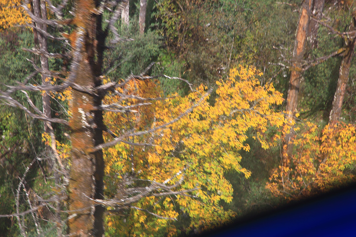 在玉龙雪山转完蓝月谷等几个景点之后就差不多十二点多了,我们乘坐景区的大巴车到集合地点,在集合点稍事休息解决完午饭后就开始朝着玉龙雪山主峰出发。 在缆车上看到金黄的树叶。