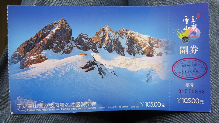 丽江旅游已经发展的很完善,所以在出发之前我们就决定到丽江的时候在当地报旅行团前往玉龙雪山游玩,在十一号晚上丽江闲逛的时候看到旅行社我们就进去询问,玉龙雪山一日团报价在300--500之间,因为怕价格太低的团不放心,所以我们报了一个450的纯玩团。纯玩团包括来回车费,景点门票,索道费,羽绒服,氧气等费用,但不包括午餐。 玉龙雪山门票,105元,既是门票,也是明信片。 在整个爬山过程中体消耗是比较大的,而且由于海拔高,温度有点低,我们十月中旬去的时候大概在5度左右,因此,羽绒服是必不可少的。而且气压较低,空气中含氧量较少,可以携带一些氧气瓶,我们两个人带了两瓶氧气,但只用了一瓶。在爬山的过程中体力消耗较大,经常要走几步就要停下来休息一会,休息的时候可以吃一些高热量的事物,如牛肉粒,巧克力等补充体力。