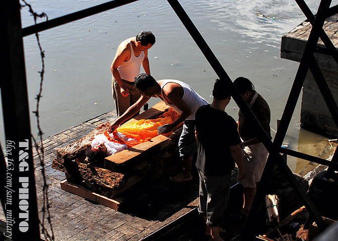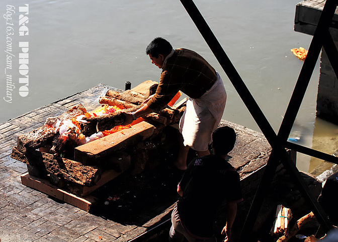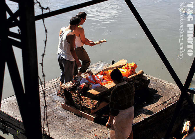 印度教火葬的全过程。印度教信徒在即将归天之际就会被送到帕苏帕蒂纳寺的一个地方,最后的时间只饮用一种特殊的牛奶,并由专人把脉。一旦归天必须在两小时内送上火葬台,所以你在这里看到火葬的人身体都还没有僵硬。在这里看不到悲伤的画面,死者家属对于死亡都很释然。点火的时候从死者的嘴开始,这个仪式一般由死者的伴侣或者长子完成。 他们对于拍摄者也是宽宏大量,只要你不去打扰他们的仪式并且表情严肃都不会阻止你拍摄的。