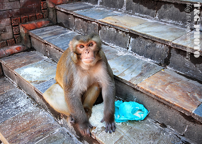 这里的猴子也不少,有些对人不太友好。它拿的就是从信徒手中抢来的贡品。