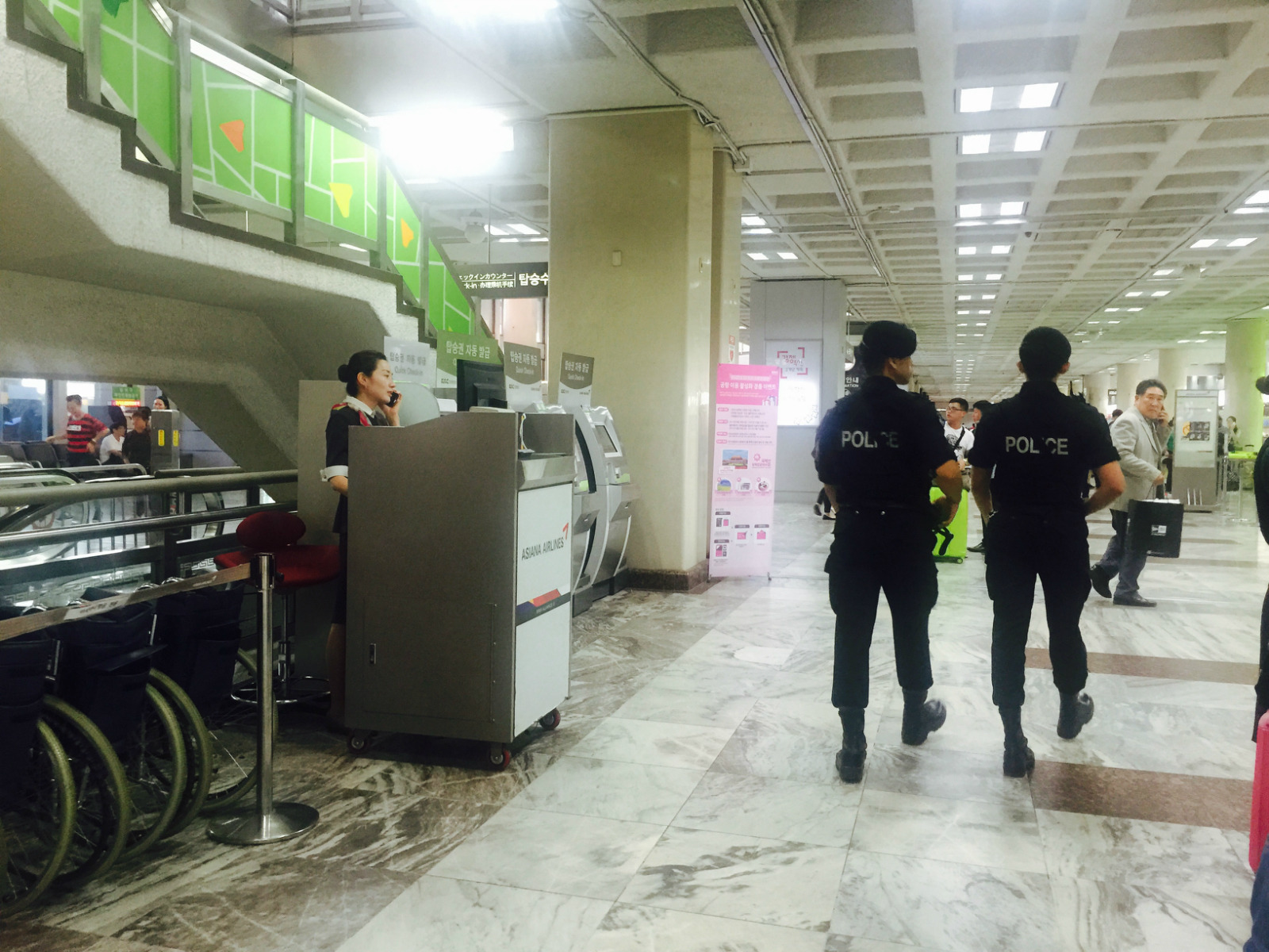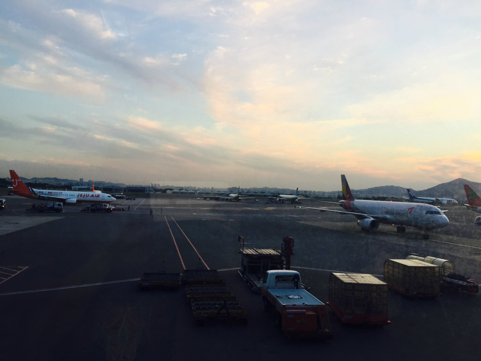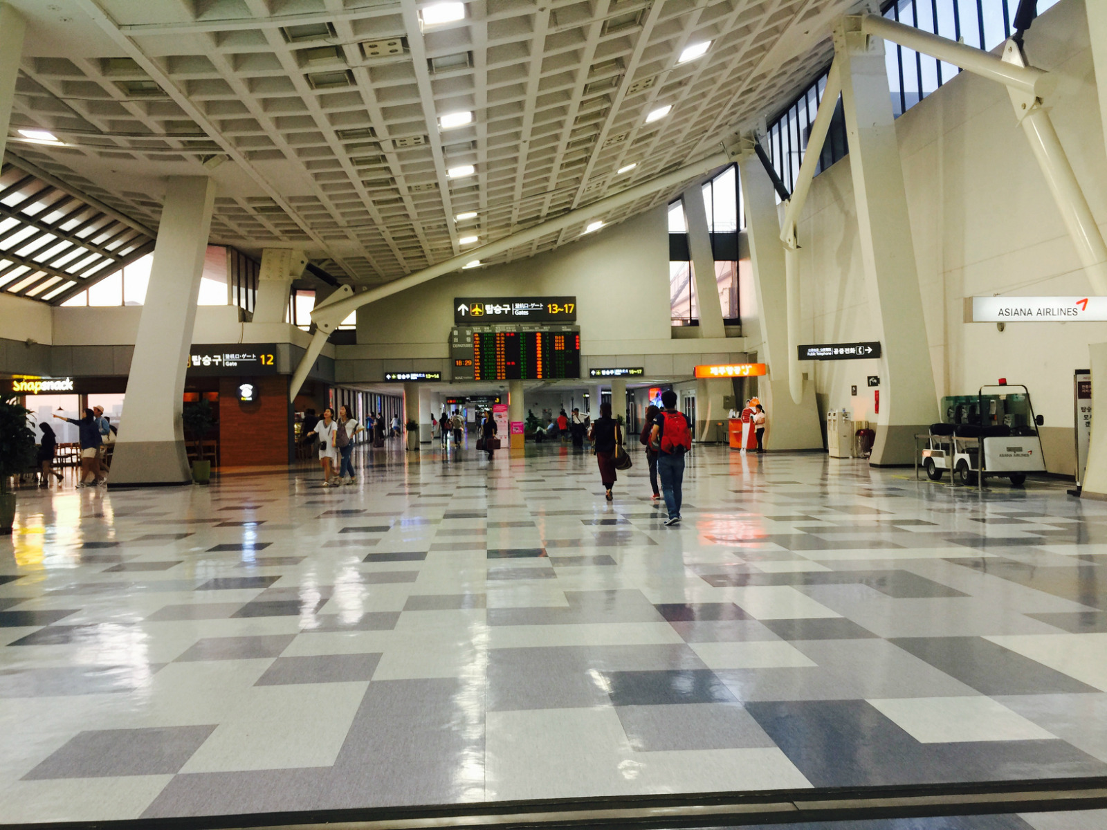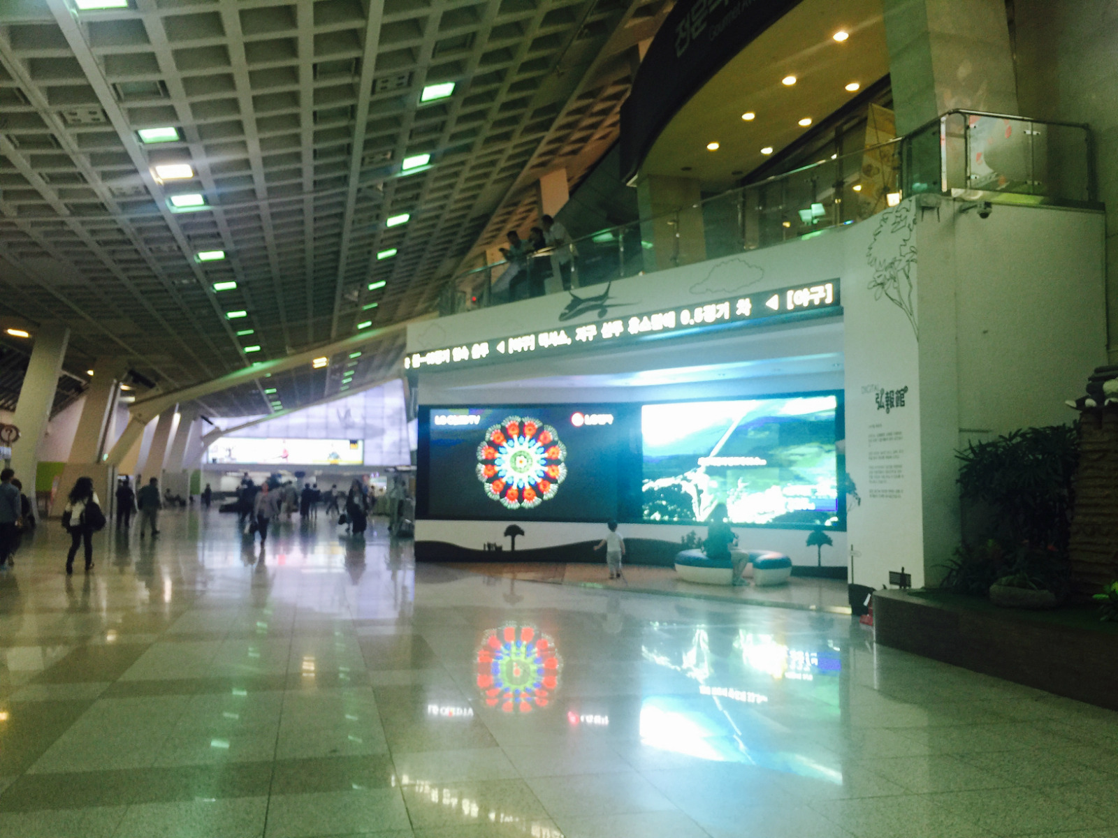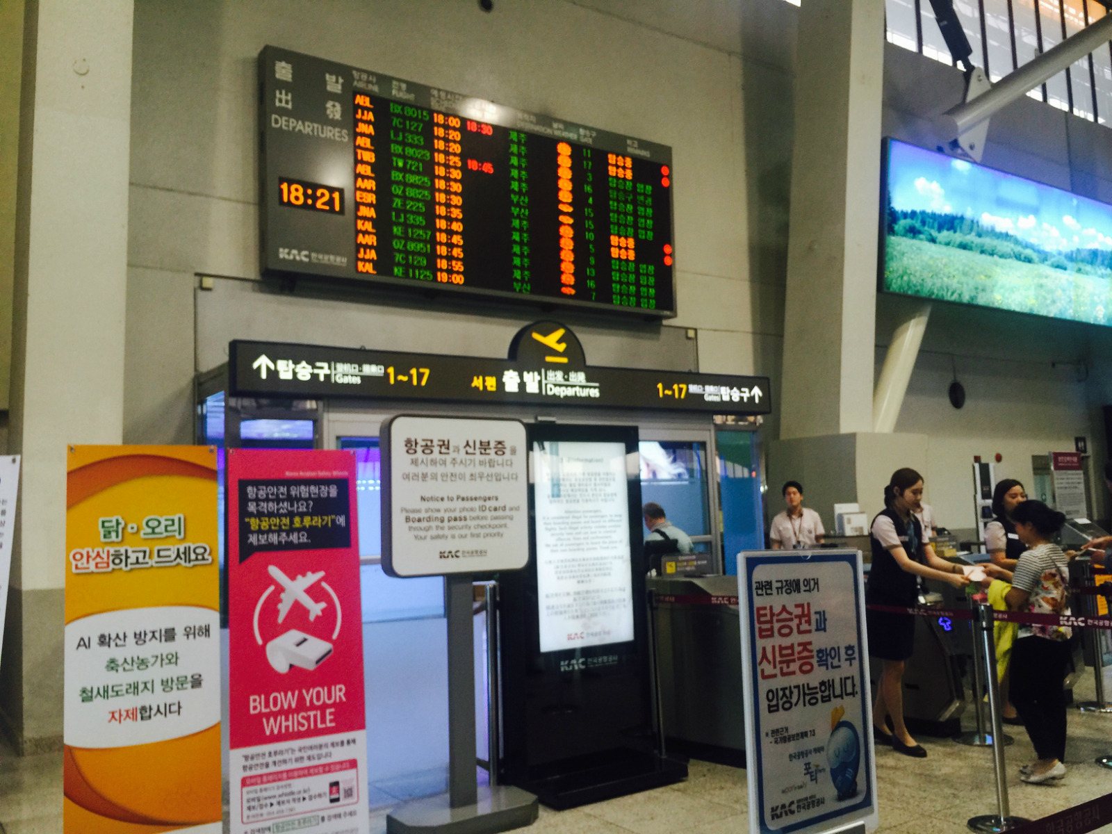 【印象】我们是从首尔飞往济州岛经过的金浦国际机场,时长1个小时,国内航班嘛,安检等手续都不是很严格,有种在国内坐高铁的感觉。与抵达韩国时的仁川国际机场相比,感觉规模小些,硬件设施稍差些,不过候机厅的LG、三星电视让等待的时间变得没有那么漫长了。