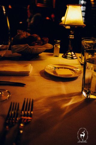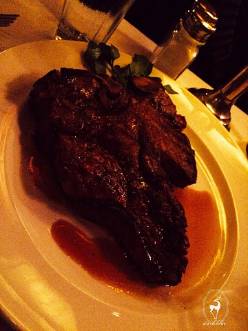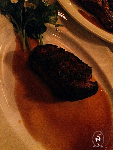 15分钟左右,重头戏的两份牛排上来了。一份T-bone好像是300G,另外一个似乎是150G的Filet。灯光太暗,就不细心创作图片了,重点是热呼呼的食物怎么能放冷了呢!废话不说,先吃为快!要了medium的火候,烤得恰到好处,肉质扎实,嚼起来却满含汁水,好评啊好评!
