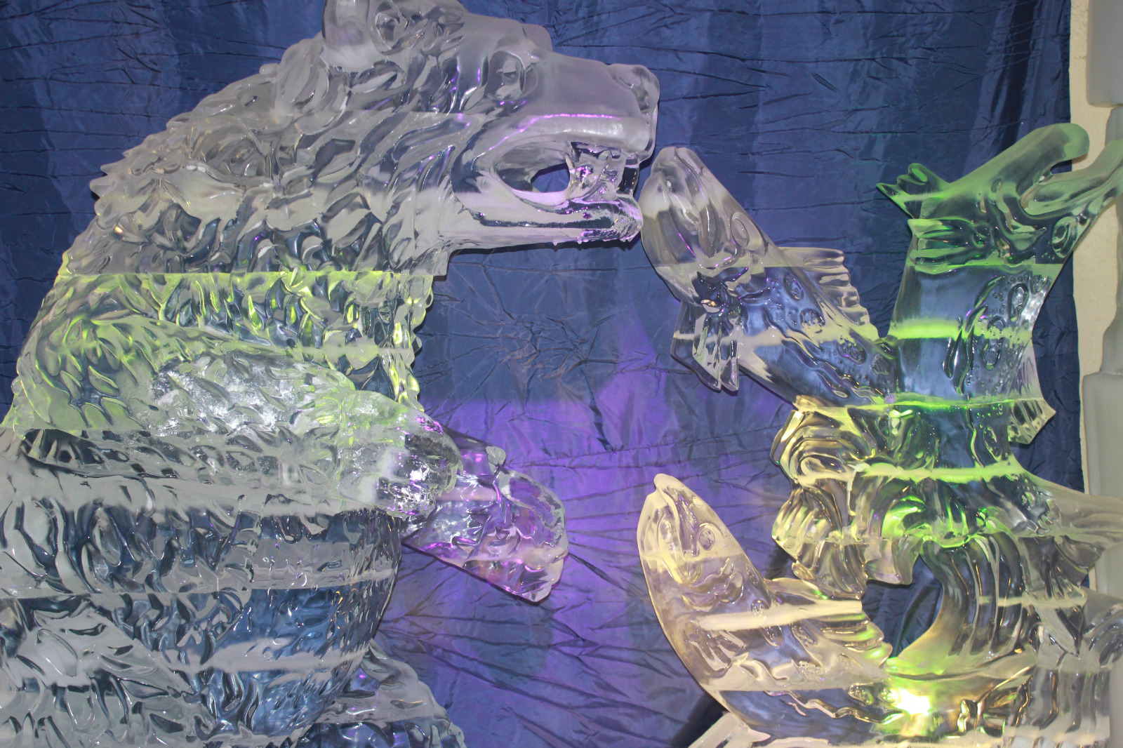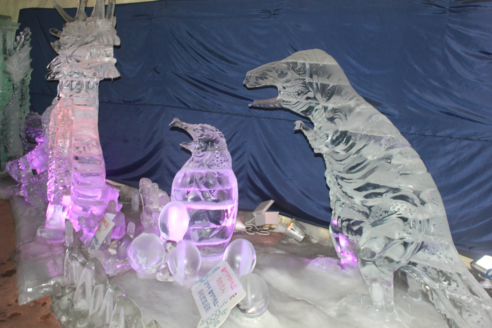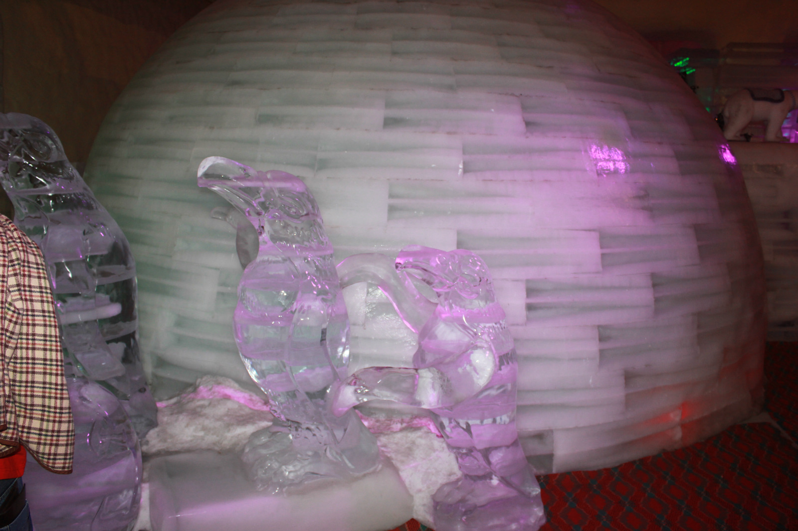 里面主要还是以各种各样造型的动物为主的冰雕,还有一个冰屋子,进去不到10秒钟,就冷到出来了,感受一下环境就好了,幸亏穿的是跑鞋,很多人穿凉鞋都冷死了。