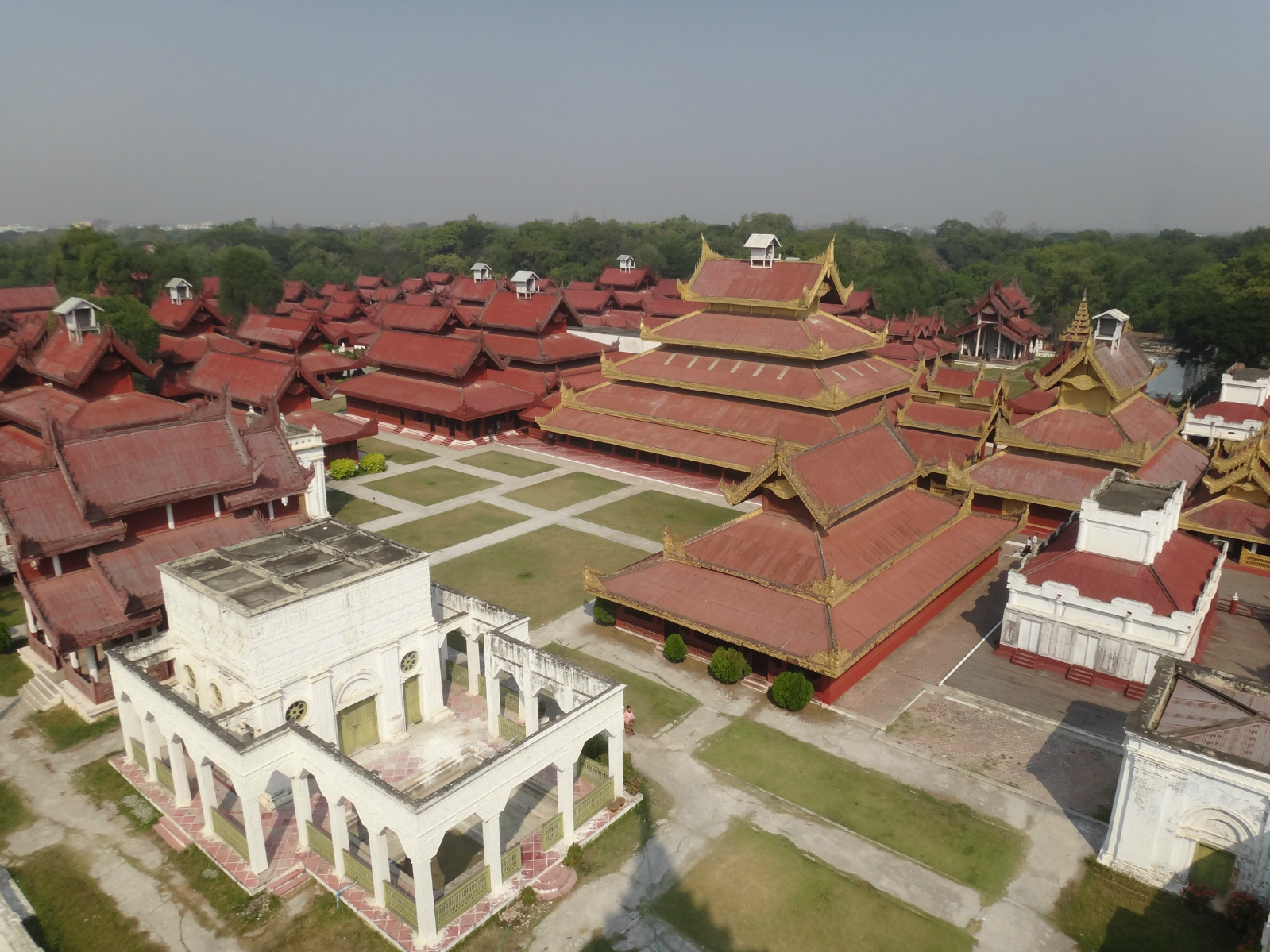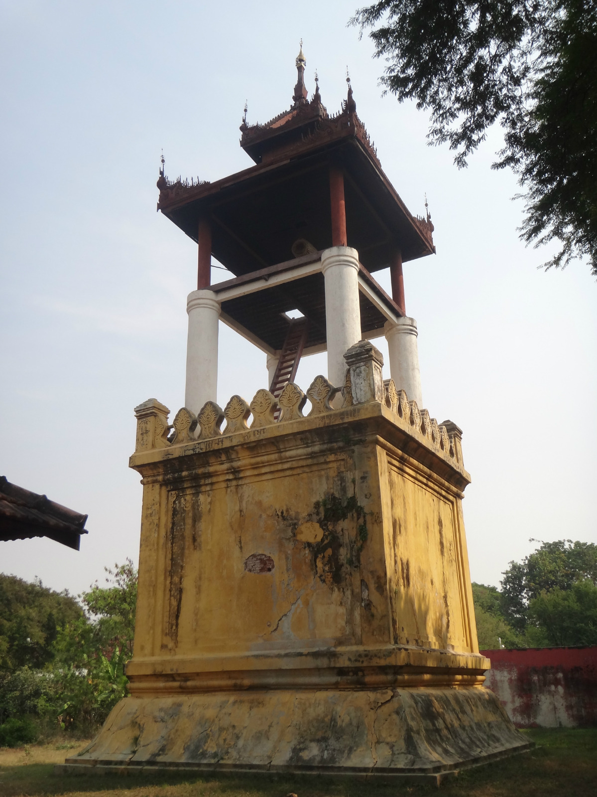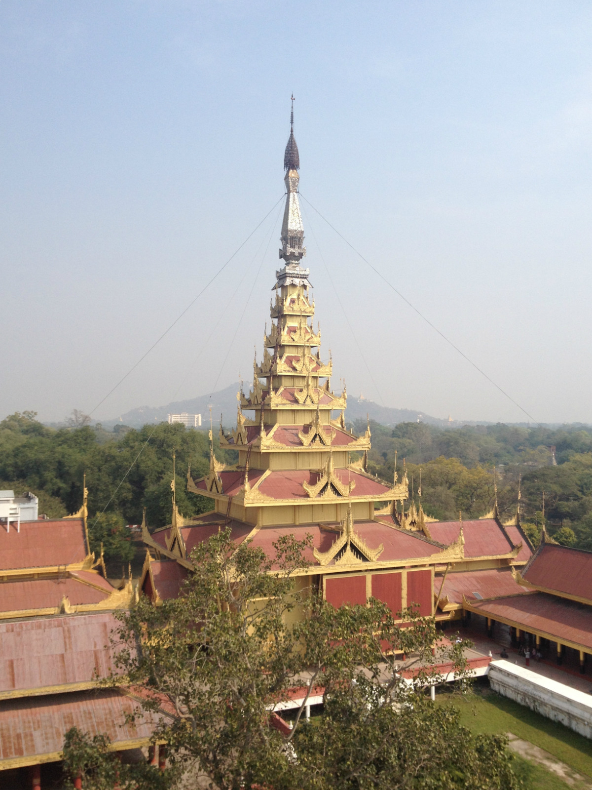 曼德勒宫,Mandalay Palace,位于曼德勒皇城中心地带,以护城河和城墙与周边隔离开来,里面现有居民居住,同时也是一处军营所在地,因此宫内不允许外国人通行的禁区较多,但作为骑着单车的东亚面孔...很容易混过去。门票与皇城内的金宫寺以及茵瓦联票10000缅元,只能在东侧宫门口买票,进宫后的检票处没法买票,幸亏笔者当时是骑车进入宫中的,又返回宫门口买票。。游客只能由东侧宫门进出,骑车的游客在宫门附近的有军人值守的一段路必须下车推车通过。黄金掐丝、高高耸立的正殿引人注目,宫内有一处瞭望塔,登塔可俯瞰整个曼德勒宫,宫内有各种文物展出但并不出彩,建筑本身是最大的魅力所在。外国人禁止进入的禁区内有敏东王陵墓、鼓楼、一架废弃的飞机以及若干佛塔等。