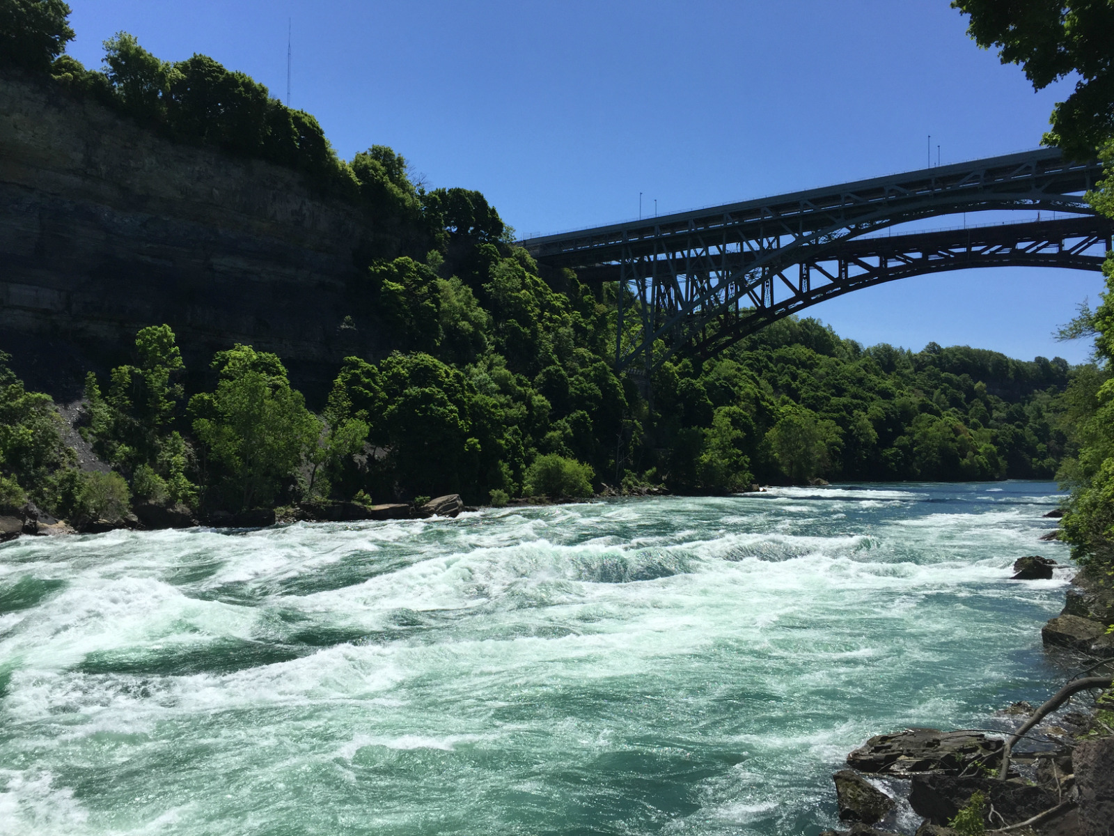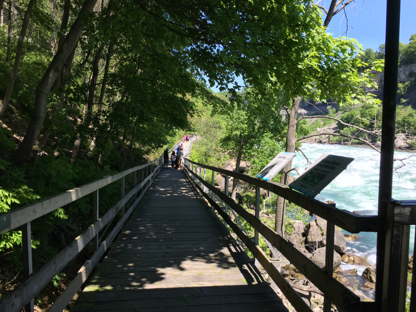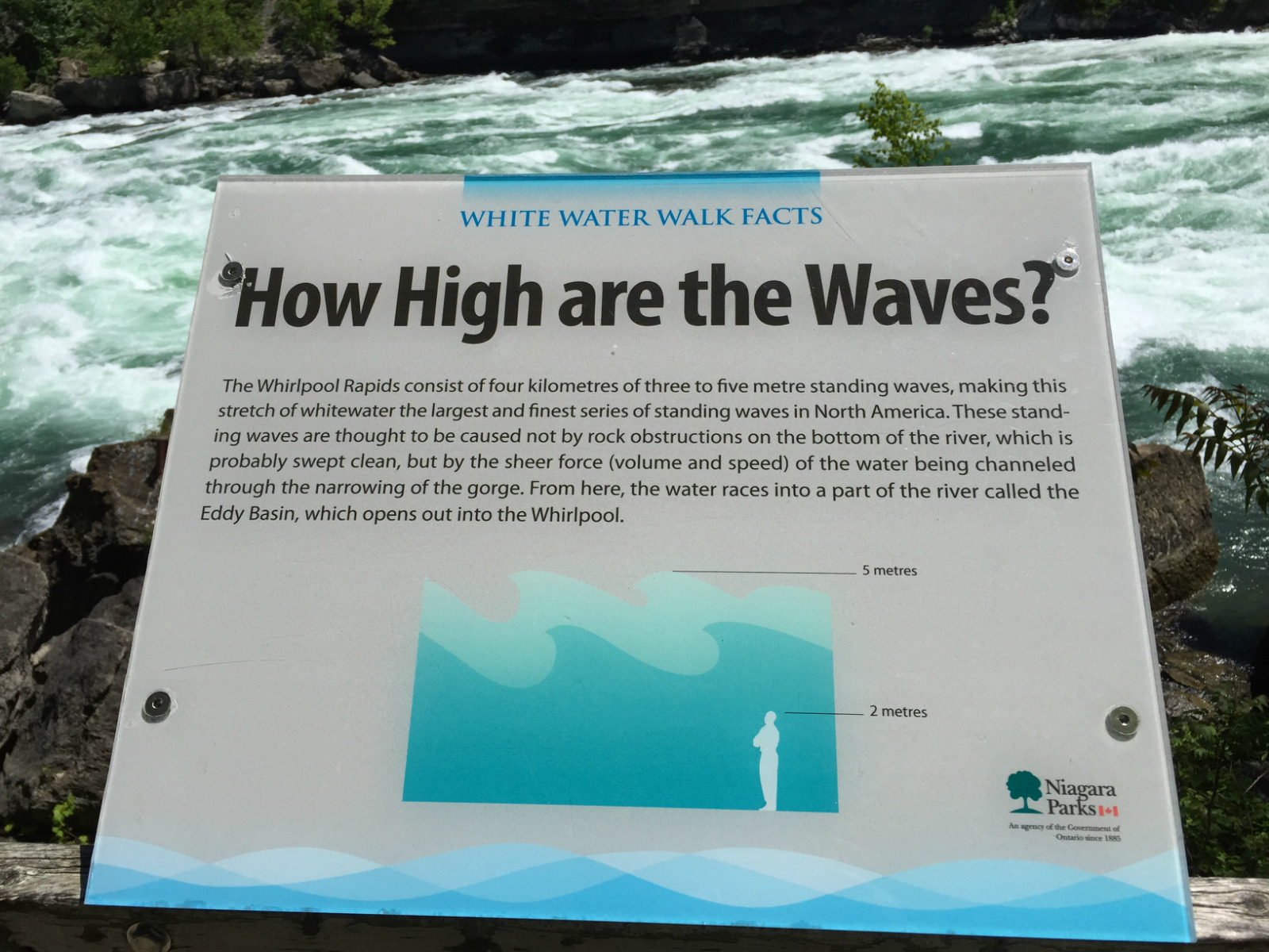 【游览建议】:这个景点距离大多数尼亚加拉景点略有一些距离。可以乘坐公交车到达。说实话这是我最喜爱的一个景点,碧绿碧绿的湍流看着就让人赏心悦目。 1)白水漫步主要观看的是湍流,湍流按照时速以及漩涡分为很多等级,而白水湍流是最高级别的六级湍流,水流速度可以达到每小时48公里。几乎和市区的车速一样。湍流的一个浪有大约5米高,他们形成一连串的驻波(standing wave)非常壮观。2)沿着木板小道前行,距离不是很长,往返大约40分钟,但是一路的风景还是非常棒的。3)如果你爱好地理,可以看到对面的山上清晰的岩石以及纹理,从而判断出这里以前发生过什么(冰河世纪的故事etc)。4)沿途的图文并茂的指示牌上有很多有趣的知识,例如湍流的等级,时速,这个地区的植物,动物,还有一些问题,例如湍流为什么是绿色的,都可以在这里找到答案。建议抽时间看一看。5)从古到今,很多人都尝试战胜这个湍流达到河对岸,他们中不乏名人,例如第一个横跨英吉利海峡的游泳健将,建造了所谓的“永不沉没”的小船的能工巧匠,漂浮的大桶等等,大多数人都失败了,很多人都付出了生命的代价,在入口处的宣传处列出了他们各种战绩和使用的方法,他们的勇气还是可歌可泣的。