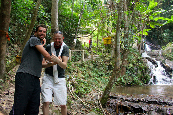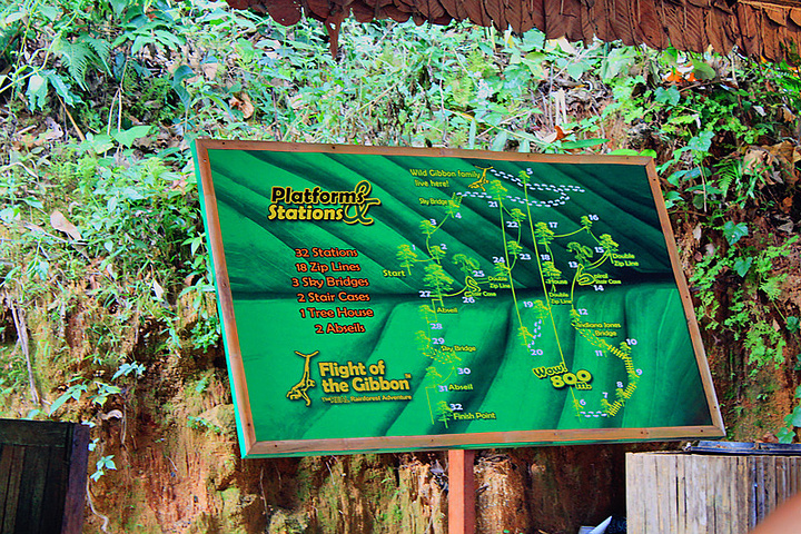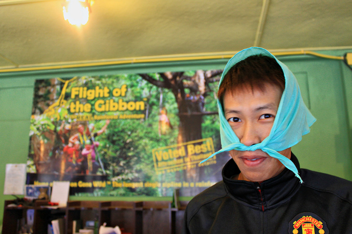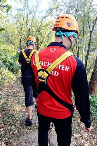 丛林飞跃是提前一天定的。清迈基本上就有三间玩丛林飞跃的公司,不过主要都是两间,一家是泰国本地开的jungle fight,另一家是外国开的fight of gibbon,前者费用较为低一点,大概2500B左右吧,前边要徒步大概半小时,后者贵点,2900B,但听说风景好点,而且有长臂猿(就是gibbon)看, 所以就选了后者。