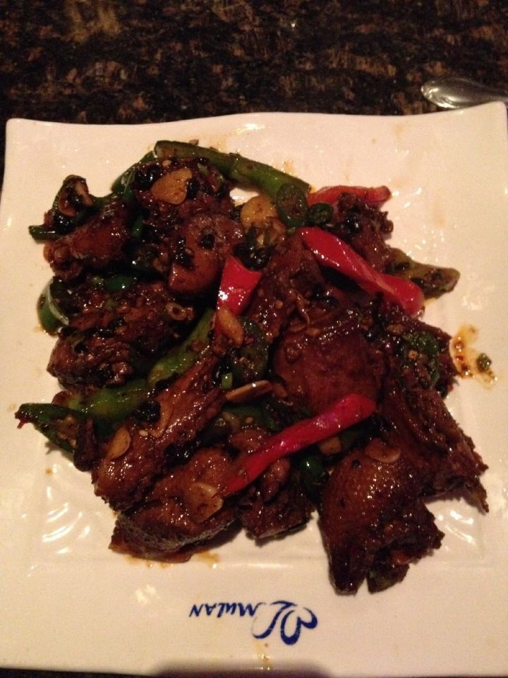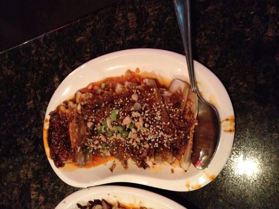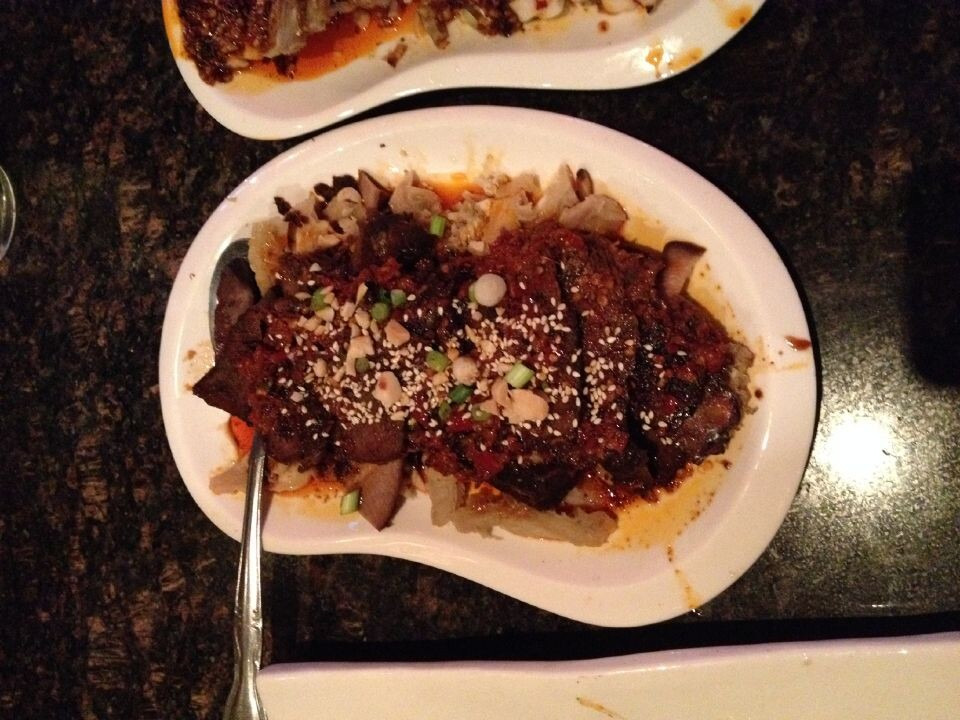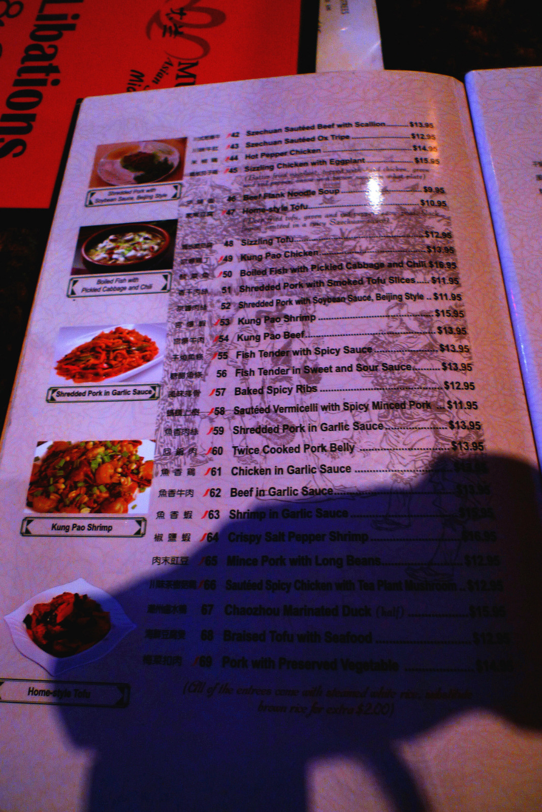 【菜品】它家的菜单前面是美式中餐,可以直接略过,后面几页就是正宗川菜和湖南菜啦,菜单是中英文双语的。点了两个冷盘:蒜泥白肉,夫妻肺片,蒜泥白肉的红油很香,夫妻肺片选材讲究,都是比较好的部位,最关键是量超大,完全可以当主菜吃。另外还点了一个热菜:湖南土匪鸭,选材新鲜,鸭肉甜咸辣交织,非常入味,量也巨大。