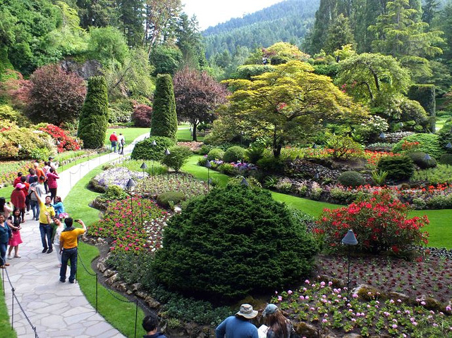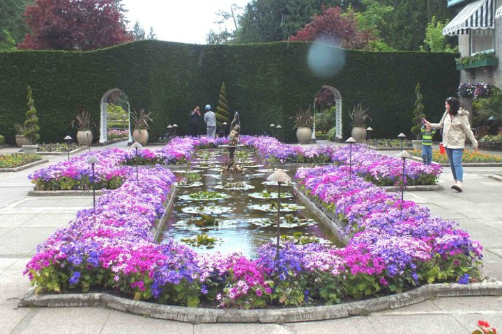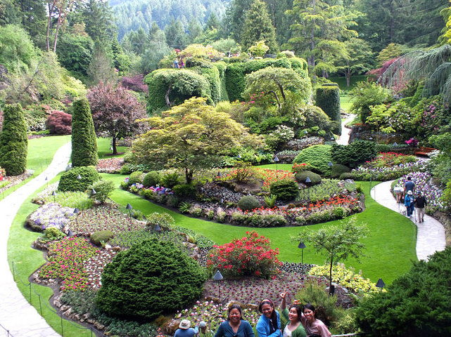 在维多利亚,我们的游览重点是布查特花园。 布查特花园是废墟上建起的美丽田园,它是加拿大维多利亚市的一个私家园林,目前已经变为加拿大的一个景点。它充满了无数的花卉,作为花的海洋,每年有无数的游客观看。 那里原是一个水泥厂的石灰石矿坑,在资源枯竭以后被废弃。Butchart夫妇合力建造了这座花园。布查特太太把石矿场纳入家居庭院美化之中,有技巧地将罕见的奇花异木揉合起来,创造出享誉全球的Sunken Garden(下沉庭院),所采用的花卉植物多是夫妇俩周游世界各地时亲手收集的。目前主要景观分为:玫瑰园,意大利园,星池和日式庭院。花园的布局曲折多变,景致多样,处处鲜花盛开,这也许是我们这帮驴友见过的最美丽的一个花园了。