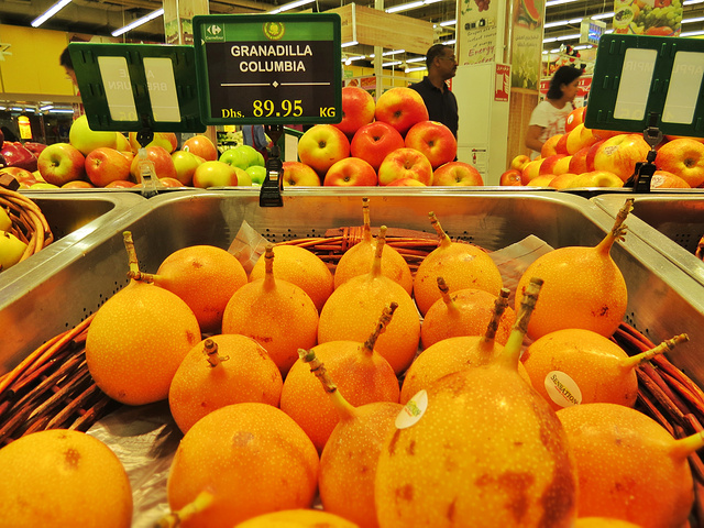 离开天堂般的清真寺,睡一觉,我们又回到了凡世。 说来好笑,我们最期待的事情之一,竟是好好逛逛阿布扎比的家乐福。事实证明,家乐福不负厚望。 水果区像个小联合国,这里的每种水果都有来自世界各地的品种,插上对应国家的小旗子。 比如这苹果,就分别来自法国,美国,新西兰,和我们中国。