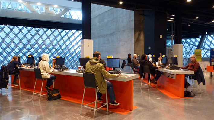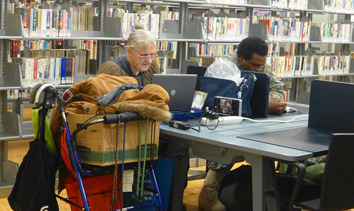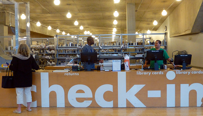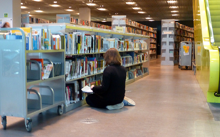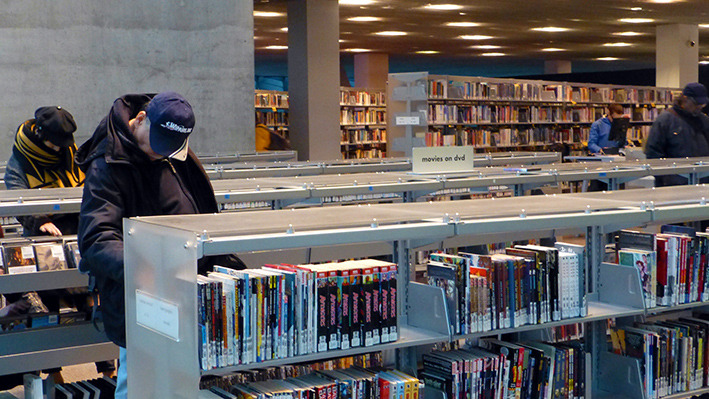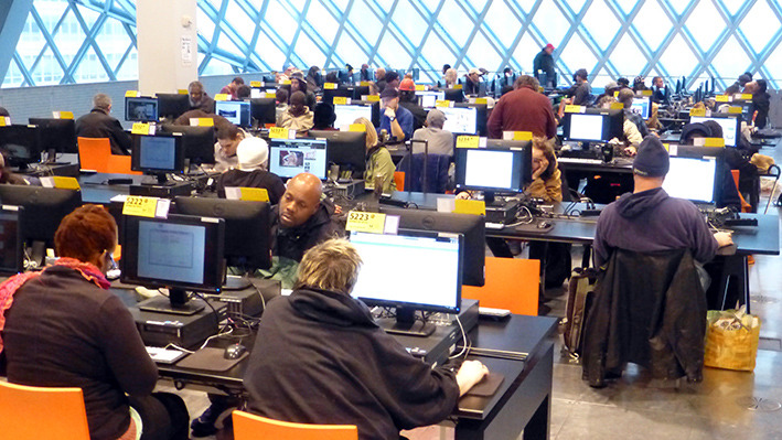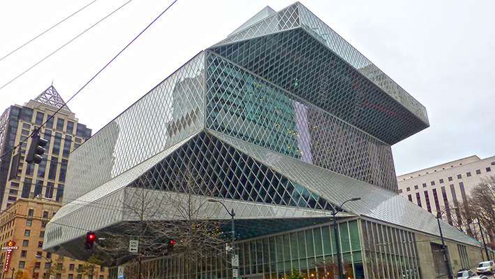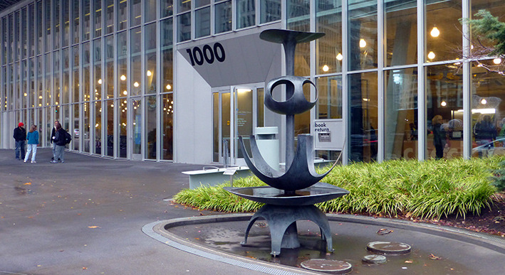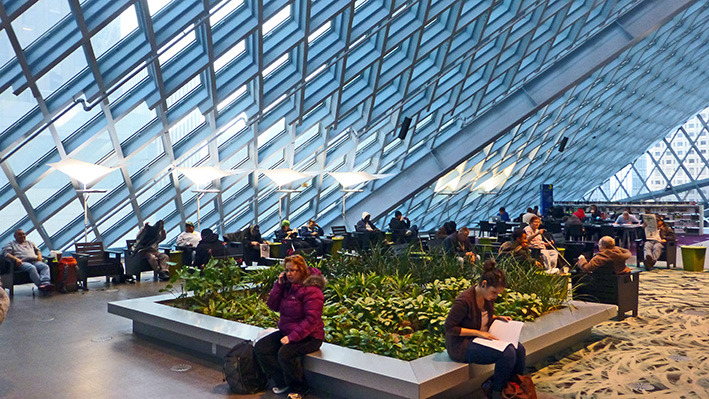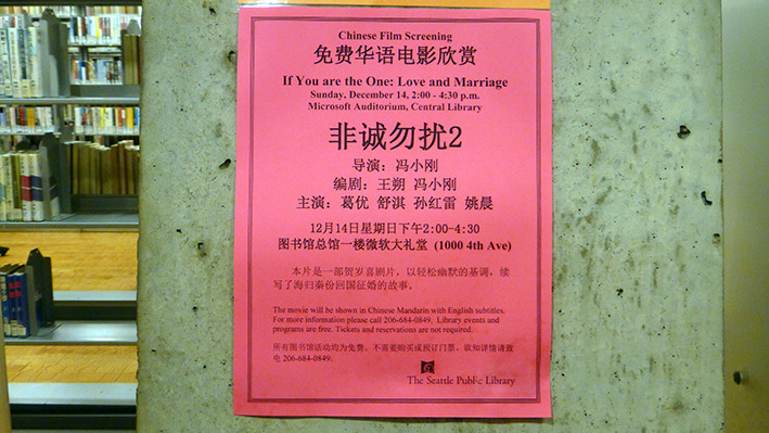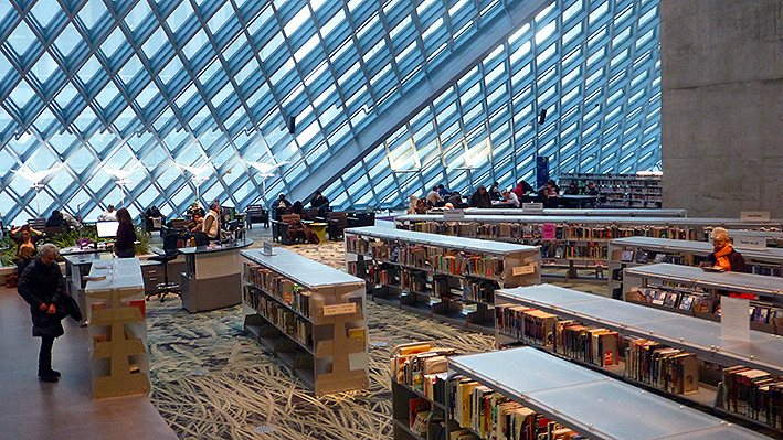 美国人周末去图书馆是一种生活方式。西雅图很多开往DOWNTON的公交车都经过公众图书馆。公众图书馆设计造型很特别,玻璃幕墙,里面采光很好。周末图书馆人很多。有借书还书的,标有语种的书架上,中文书不少,还有即将上演非诚勿扰免费电影的广告。图书馆地面有各种文字,据说地面是竹子质地,看起来像橡胶地板。看到一排中文字,厨师老了,做的菜的味道更老道了。楼上有咖啡厅,玻璃透光很好,中间还有很大一块室内草坪。再上一层,四周全是电脑,大约有超过百人在使用,有老人,不少是少数族裔人群。美国人在图书馆上网查资料,休闲,或几个人在一起小声地研究店问题,也有一些残疾人,坐轮椅到图书馆借书还书。孩子们背着书包,一次性借还十来本书呢。我们正好走累了,在图书馆坐下来,上网,休息。