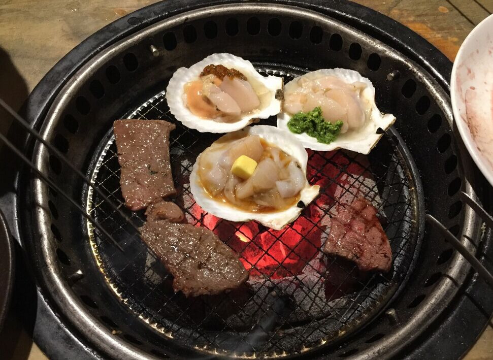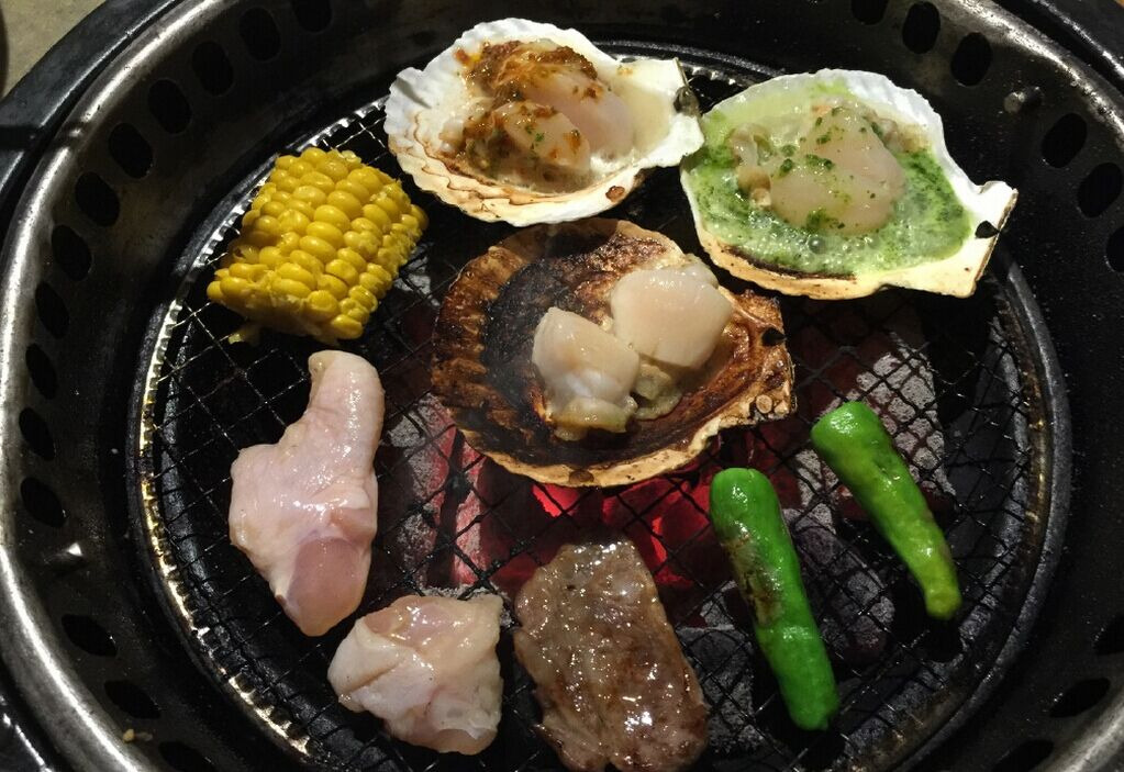 【餐品】这里的肉类默认就是用酱汁先腌渍过的,味道并不咸,切片不是很厚,这样烤起来比较容易熟。那种肥瘦相间的也挺好吃的,脂肪部分比例适中,不会明显感觉油腻。蔬菜的品种也很多,玉米、甜味辣椒以及香菇切片都可以来烤,这种地元食材多曲子京都西北部的山村,品质优秀,吃着放心,味道也不错。