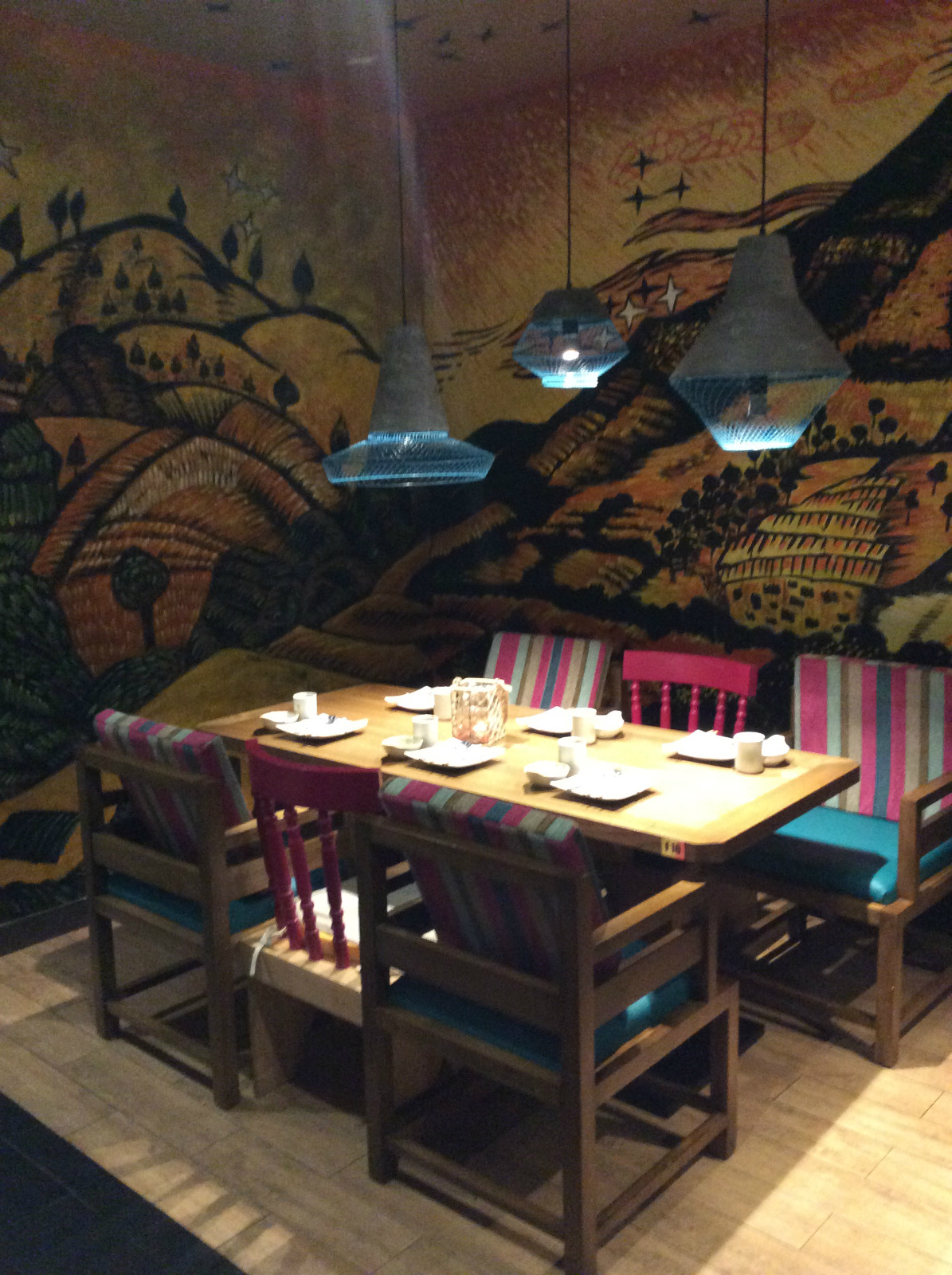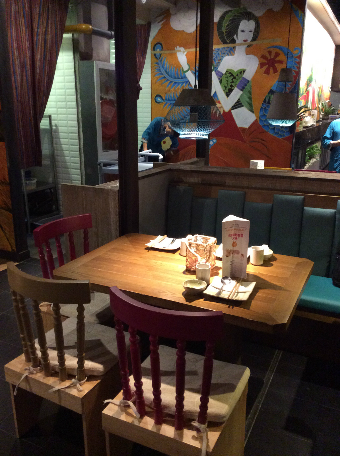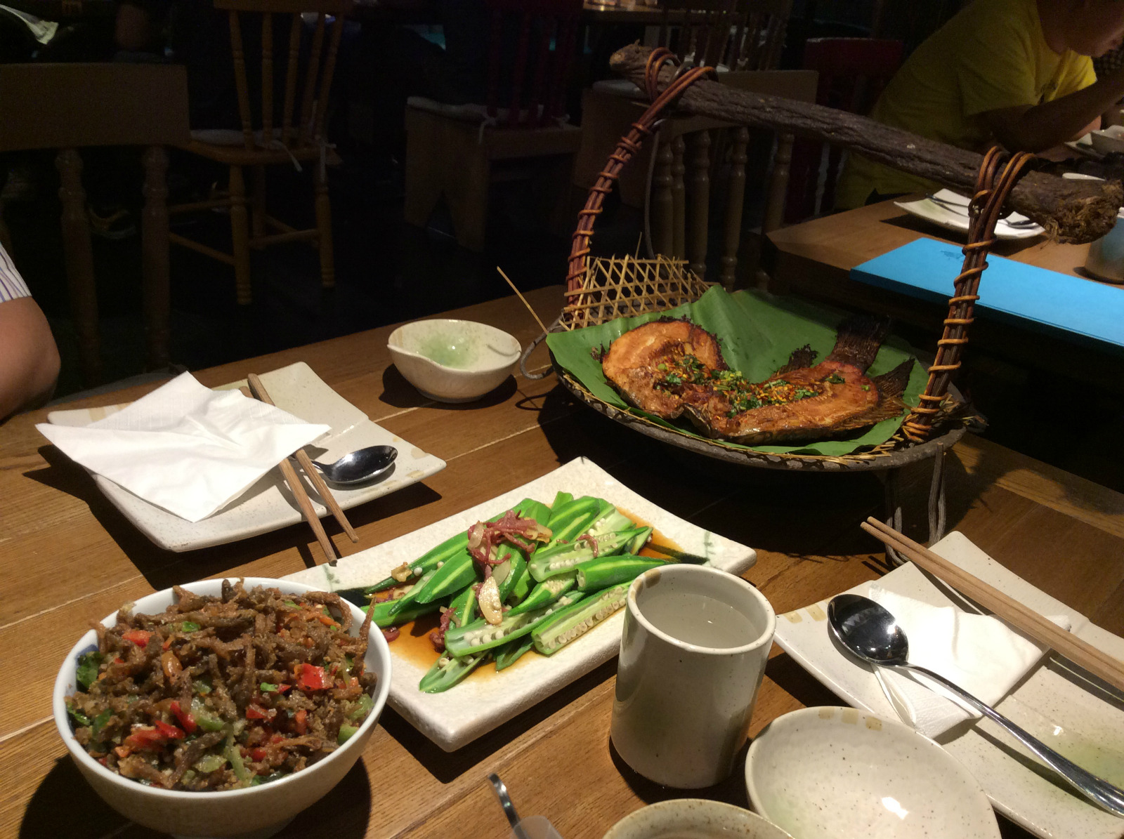 入住上海皇家艾美酒店,在周边吃晚饭,选择了这家彩泥云南菜,整体感受环境第一,口味第二。***位置及交通:彩泥云南菜位于人民广场百联世茂商场5楼,从酒店到餐厅,不用出酒店,8楼换乘即可。世茂百联商场位于人民广场,交通很方便,3条地铁站从此穿过,一号线,二号线,8号线均经过此地,人民广场站下车即可。***餐厅环境:环境是餐厅的一个亮点,充满了异域风情,壁纸是一个亮点,各式各样的彩绘很有风格,小餐桌和椅子与整个环境很好的融合,整体的设计融入了很多少数民族的风格,屋顶也是装饰成了木质梁脊式。***餐品味道:点了炸小鱼,本以为量会很大,但菜一上来只有一小碗,而且只有上面的一层是鱼,下面是很虚的脆饼,感叹好虚亚,味道有些过于咸。蔬菜点了秋葵,中规中矩,无亮点。主食点了烤鱼和鸡,烤鱼味道是真心的非常一般,而摆盘的小篮子很有意思。鸡肉也是中规中矩,主要是沾酱汁。主食点了竹筒饭,结果一上来很小很小的量,而且米饭并没有什么特别的香味。甜品点了酸奶,也很一般。***服务:餐厅的服务员配备还是很充足的,但总感觉有些小混乱的感觉,加水要求了很多次才有人过来加,服务一般。***价格:虽说量很小,价格却小贵,三个人吃了差不多400元左右,人均大约在130元左右。***周边配套:楼下就是南京路步行街,吃晚饭可以去逛逛,下楼的时候会路过M&M’S World, 带小朋友的小伙伴不容错过呦。