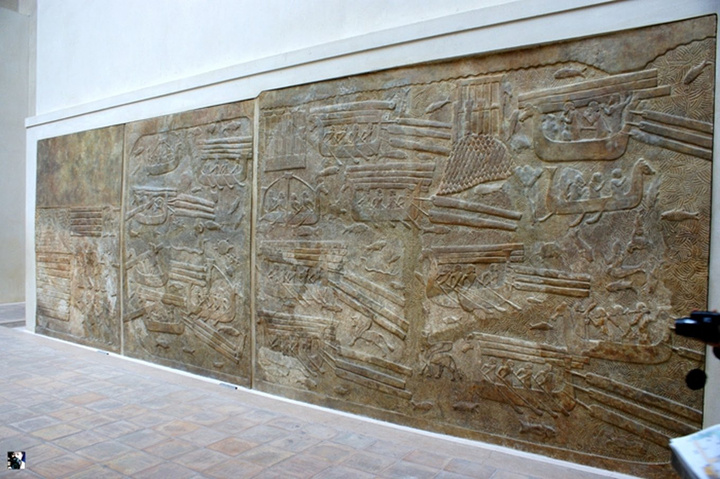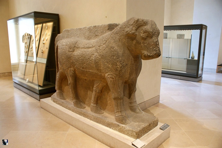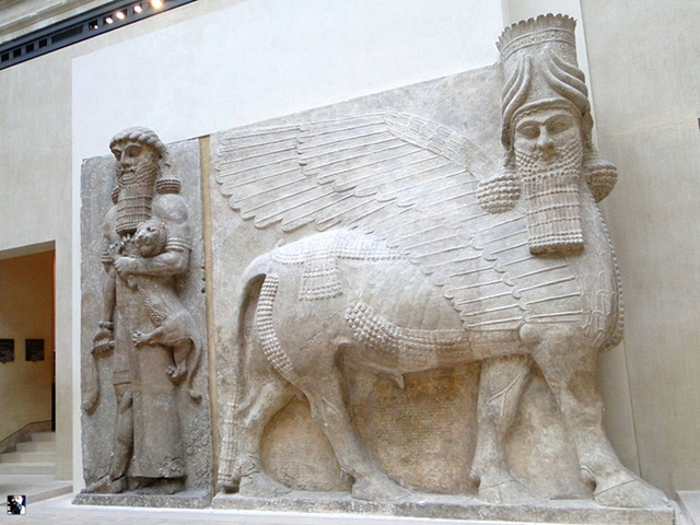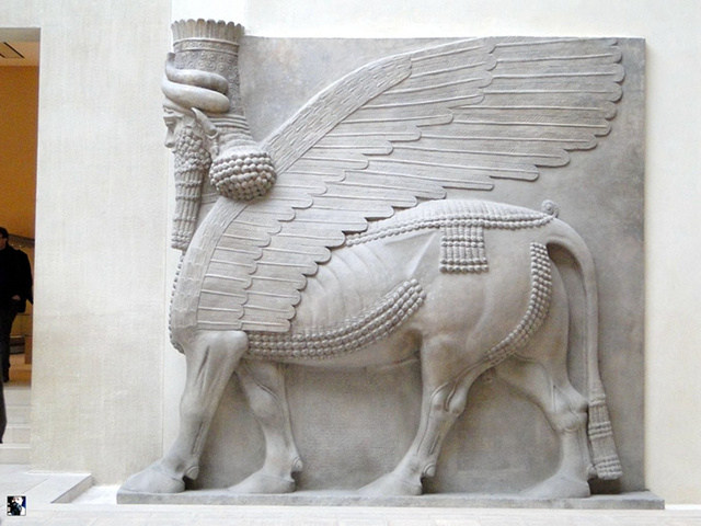 在亚述巴尼拔在位时,国力达到鼎盛,已经进入铁器时代,人首牛身带翼的神兽就出土于亚述帝国遗址。曾经在伊拉克赫尔沙巴德的亚述国王萨尔贡二世的宫殿大门口有高约4米的人面牛身的石雕做为守护神,人面是国王的脸孔,高冠、长胡须,牛身前端立体雕刻,突出于城门外。这些巨大的带翅膀的牛身人面雄伟雕像,来到法国经历过一段曲折的历史。1843年,法国人保罗•埃米尔•博塔发现了这些雕像,冒着各种危险将它们运到巴黎,其中两个雕像于1847年陈列在卢浮宫内的世界上第一个亚述博物馆中;第三个雕像在浅盐湖的船舶失事中幸免于难,于1856年运到巴黎;第四个雕像则沉入湖底,是用石膏塑像替代的。