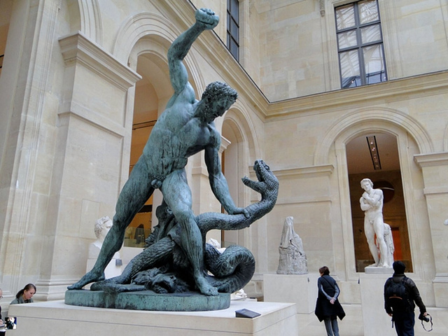 《赫克里斯与化为蛇的Acheloos河神战斗》,作者Francois Joseph Bosio。赫克里斯是希腊神话中宙斯的儿子,是大力神赫拉克利斯的罗马名字,Acheloos是希腊地区的一条Acheloos河的河神,以善于变身而著称,最擅长变为雄牛和巨蛇。
