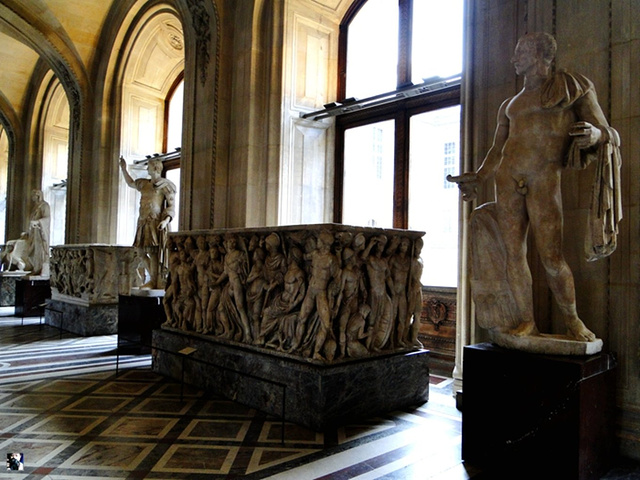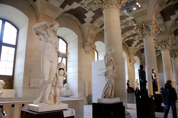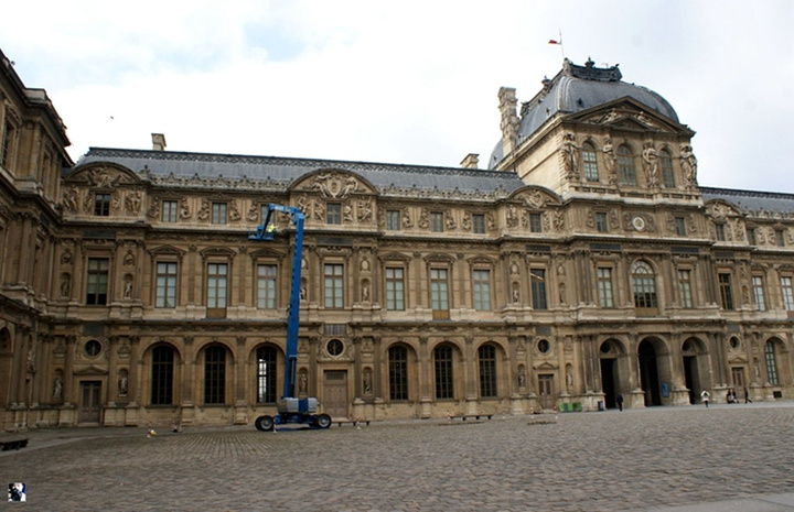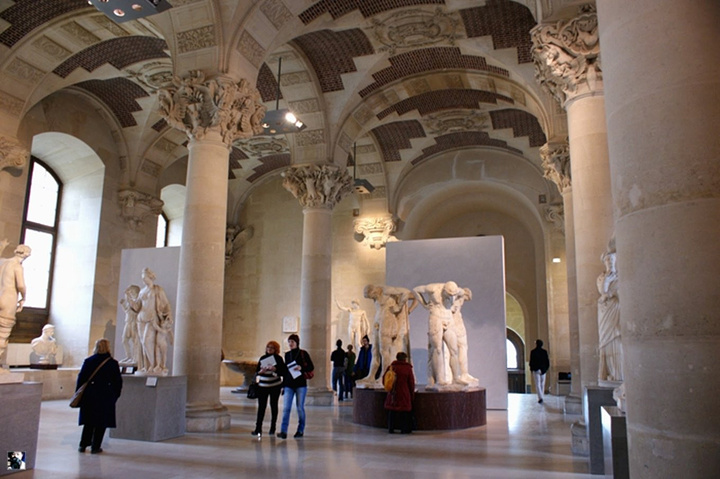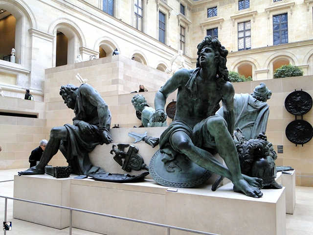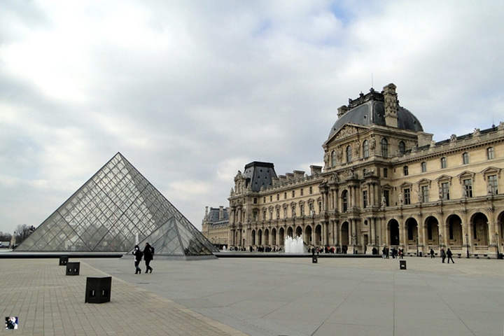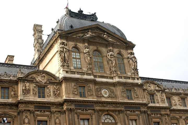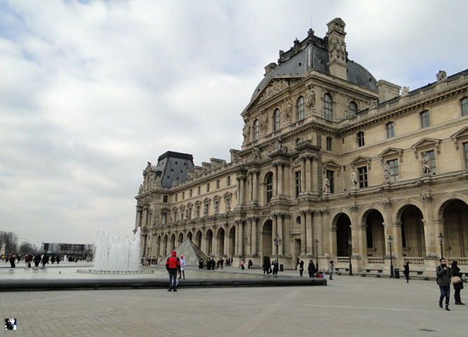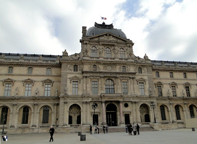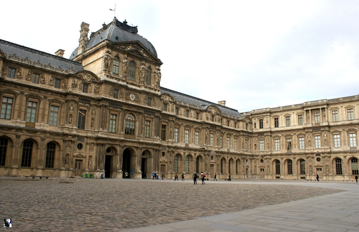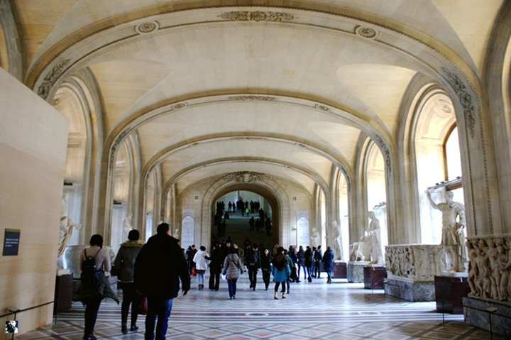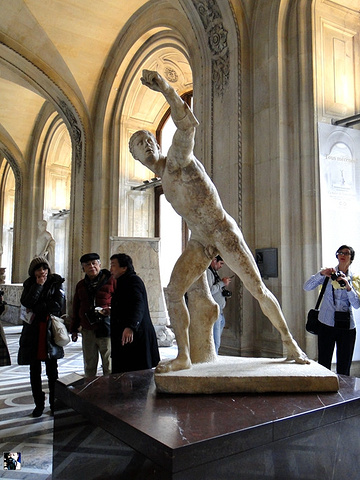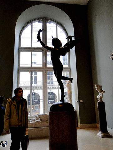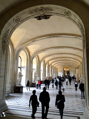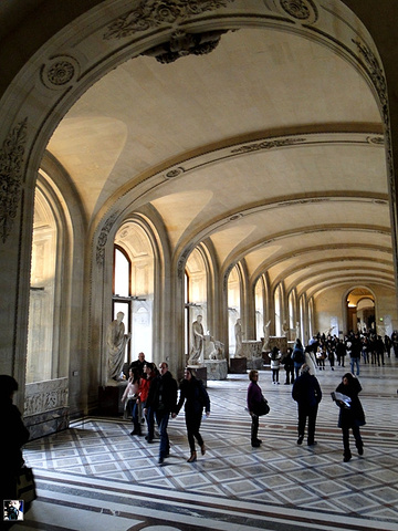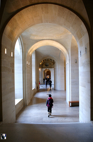 我们一头钻进马路对面正对着艺术桥的那扇门,里面就是著名的法国卢浮宫Cour Carree(中央方厅广场)了。 Louvre(卢浮宫)位于法国巴黎市中心的塞纳河北岸,始建于1204年,历经800多年扩建重修达到今天的规模。 想在巴黎参观展馆美术馆或者看展览,既是很容易也是很难的一个选择,容易是因为多,随便进去一个都会有所收获;难也是因为多,如果时间有限、语言不通就很难取舍。 如果简单地以国际知名度和主要馆藏作品的年限划分的话,法国最重要的三个国立美术馆当属巴黎的卢浮宫、Orsay(奥赛博物馆)和蓬皮杜艺术中心了。 卢浮宫收藏世界古代文明和欧洲中世纪以来的艺术藏品,原来重要的亚洲和非洲藏品已经分别转给专事亚洲古文明艺术的Guimet Museum(吉美博物馆)和以非洲藏品为主的Guai Branly Museum(凯布朗利博物馆)。 奥赛博物馆收藏以十九世纪中叶以来至二十世纪初的西方现代艺术(1848年至1914)为主,其印象派作品收藏尤其重要。 蓬皮杜艺术中心以二战之后的现代当代收藏为主,蓬皮杜从立项、设计、开馆、运营已历经三十年的实践,它除了在多媒体图书馆和专业文献资料方面做出了全世界独一无二的贡献,而且在艺术展览之外的视觉、音乐、造型、舞蹈、建筑、多媒体、公共空间、少儿美育研究等诸多方面做出了极具前瞻性的探索和实验,对以法国为中心的欧洲美术馆文化产生着重要影响。 我们时间有限只能三选一,最终选择的是进卢浮宫。