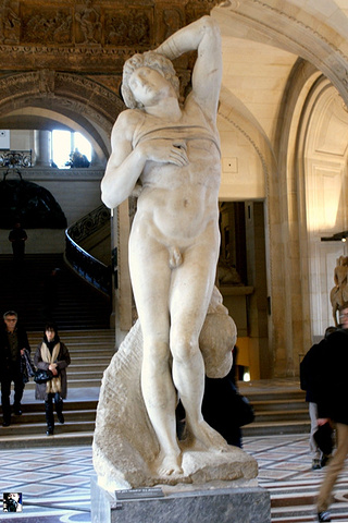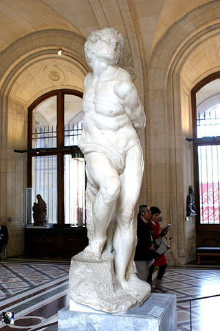 《反抗的奴隶》又名《被缚的奴隶》,他壮实的躯体呈螺旋形拧起,力图挣脱身上的绳索,这种动势的转折,体现了巨大的内在激情,似乎这个奴隶将要迸发一股无比强大的反抗力,面部表情显露出坚强不屈的意志,有人称这尊雕像是“反抗的奴隶”。在这里,人的尊严得到了高度体现。艺术家以卓越的技巧,使这两块冰冷的石头产生出生命的活力。这种优美的造型感受,正是米开朗基罗所期望达到的效果。