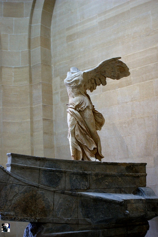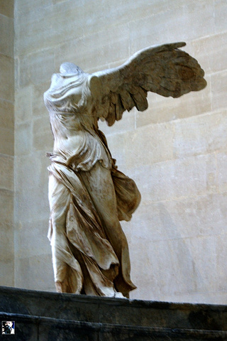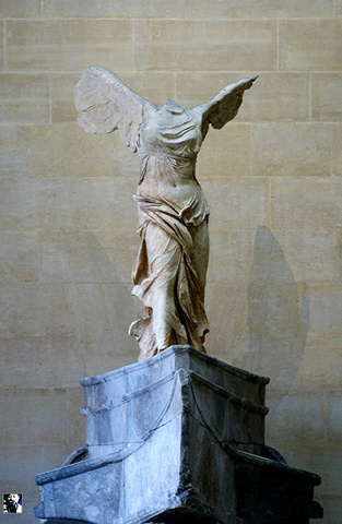 虽然胜利女神是希腊雕塑中的常见题材,但这一尊却与众不同。雕像屹立海边山崖之巅,她前倾展翅欲飞之态,那健壮丰腴、姿态优美的身躯,高高飞扬的雄健而硕大的羽翼,都充分体现出了胜利者的雄姿和欢乎凯旋的激情。迎着海风,薄薄的衣裙贴着身体,隐隐显露出女神那丰满而富有弹性的身躯,衣裙的质感和衣褶纹路疏密有致,那雕刻令人叹为观止。底座被设计成战船的船头,胜利女神犹如从天而降,在船头引导着舰队乘风破浪冲向前方,既表现了海战的背景,又传达了胜利的主题。虽然女神的头和手臂都已丢失,但仍被认为是古希腊雕塑家们高度艺术水平的杰作。
