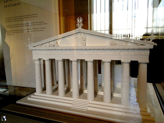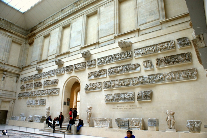 帕特农神殿浮雕,高度有四米半,虽然头部部分破损,但是人体衣纹雕饰仍可见其静态优雅、动态闲适自在,人体与人体之间的排列关系,都表现出希腊黄金时代艺术的惊人力量。