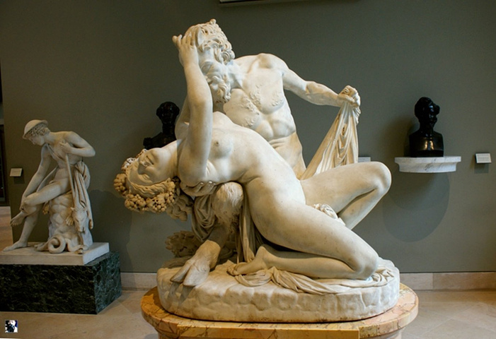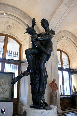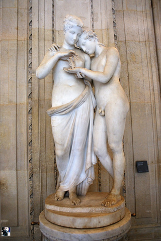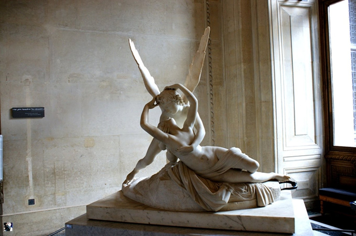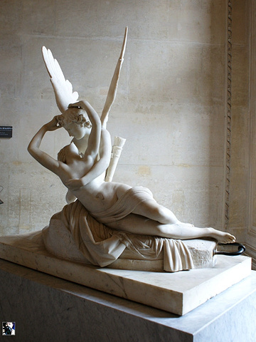 意大利雕塑家、新古典主义雕刻的代表人物Antonio Canova(卡诺瓦),1793 年的作品《被爱神吻醒的普赛克》又名《普西莎及爱神》。 雕像取自阿普列乌斯的《金驴记》的永恒主题,讲述的是爱神丘比特的母亲维纳斯妒忌普赛克的美貌,寻求种种磨难欲将普赛克至于死地,最终普赛克终于中了魔法昏死之实,被赶来的爱神丘比特深深的一吻而吻醒的故事。这个雕塑,作者独具匠心地将拥抱在一起的动态躯体处理成角椎体构图。这件新古典主义的精品,让光线在大理石表面上的效果特别成功,更显精致完美。