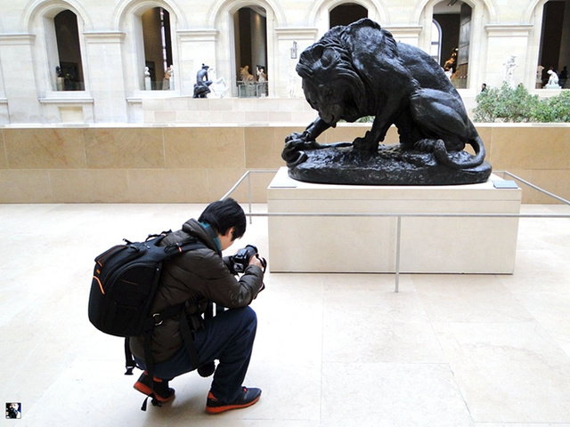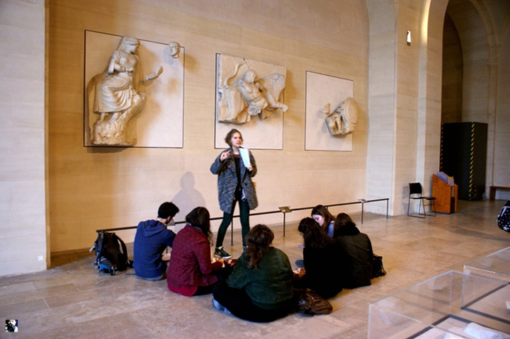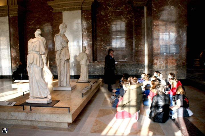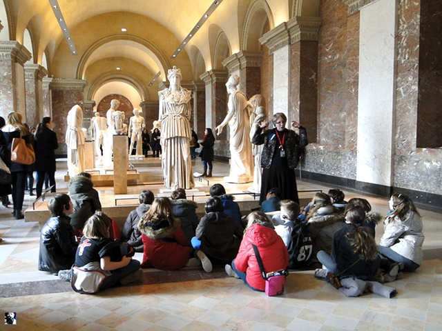 老师讲课多认真!卢浮宫也是一所艺术的最高课堂,法国人特别注重艺术教育,在展馆内见到一波又一波的学生队伍,在老师的带领下参观展览。博物馆对中小学生免费开放,老师担当起了讲解员,指着展品现场教学,学生们席地而坐,洗耳恭听,那个认真劲头,不亚于在学校课堂听课,还有当堂提问,学生们一个个争相举手发言,说明他们完全进入到了作品中去,熟悉了其中的人物情节,故事背景。这种学习我相信是会影响孩子们的一生的,在博物馆长大的孩子,未来的大师就在他们中间。