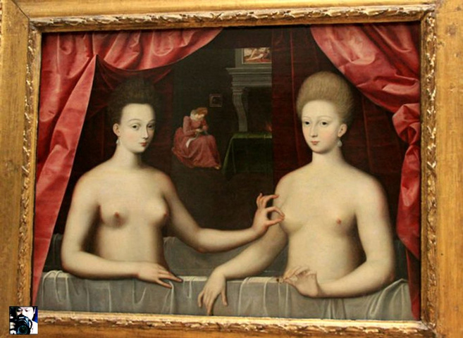 《加布莉埃尔·德斯特蕾和姐妹维拉公爵夫人》,这幅绘画的作者不得而知,但画风为典型的枫丹白露第二画派的风格。
