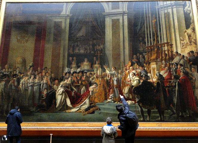 在这幅画宏大的巨作里面,我们看到的是拿破仑在巴黎圣母院举行长达10个小时的加冕典礼中的一个瞬间。这个瞬间表达的是,拿破仑已经给自己戴上了皇冠,并正在给她的皇后约瑟芬戴上皇后宝冠的那一刻情景。画家特地没有画拿破仑戴上皇冠的一刻,是因为他没有按照传统让教皇给他戴上冠冕,而是从教皇手中拿过了冠冕自己戴在了头上。由于拿破仑是自己将皇冠戴到了头上,大卫没有在画中表现他加冕的情节,最终选择了不那么有争议的约瑟芬加冕作为主题。